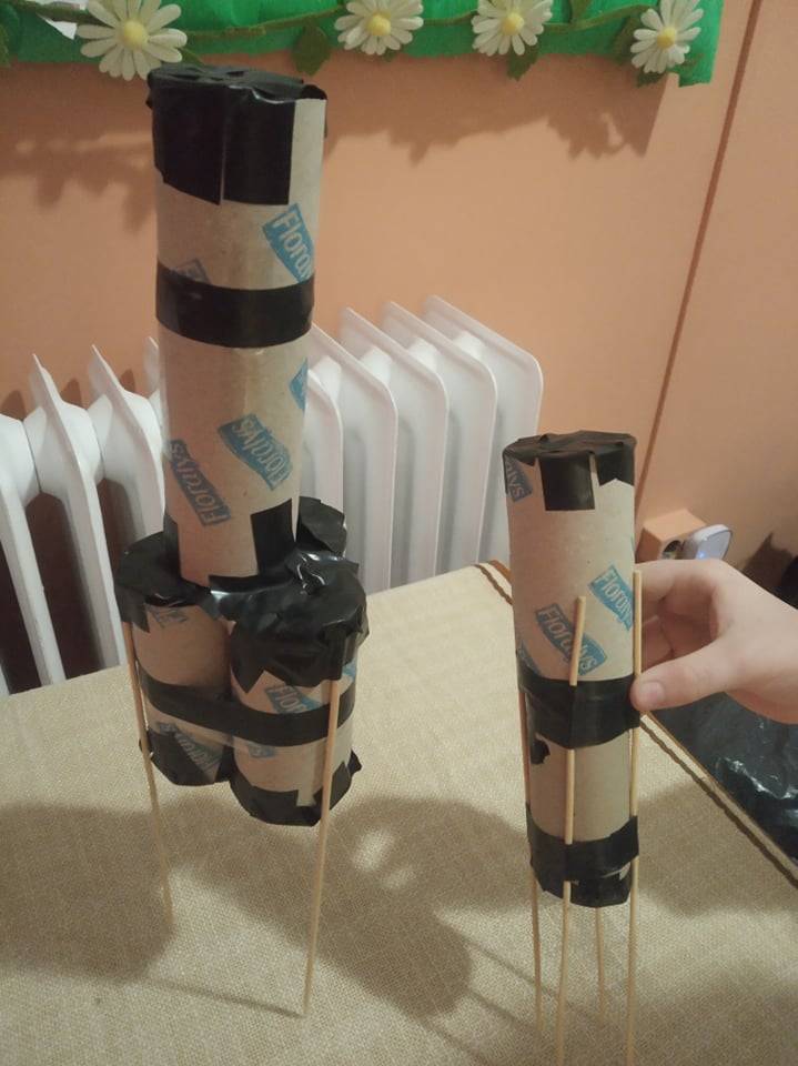 A 4. osztályosokkal fő feladatként az „Űrhajó”-t választottuk. Ennek keretében mindenki tervezett magának egy rakétát, aminek a belsejébe olyan célokat rajzolt vagy fogalmazott meg, amiknek a megvalósulását szeretné a jövőben. A kész rakétákat egy kartonra, csillagok közé ragasztottuk fel, a címe pedig a következő lett: „Cél: MINDEN! Határ a csillagos ég!” Az egyik kisfiú olyan motivált volt, hogy saját, 3D-s űrhajót is épített karton hengerekből és hurkapálcikákból (Lsd: fényképek között, alul!).