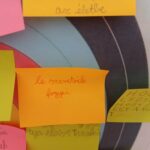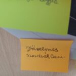 A történet után kihelyezett céltáblára összegyűjtöttük a gyerekek céljait. Ragadós, színes papírra írták őket, majd kirakták a céltáblára.