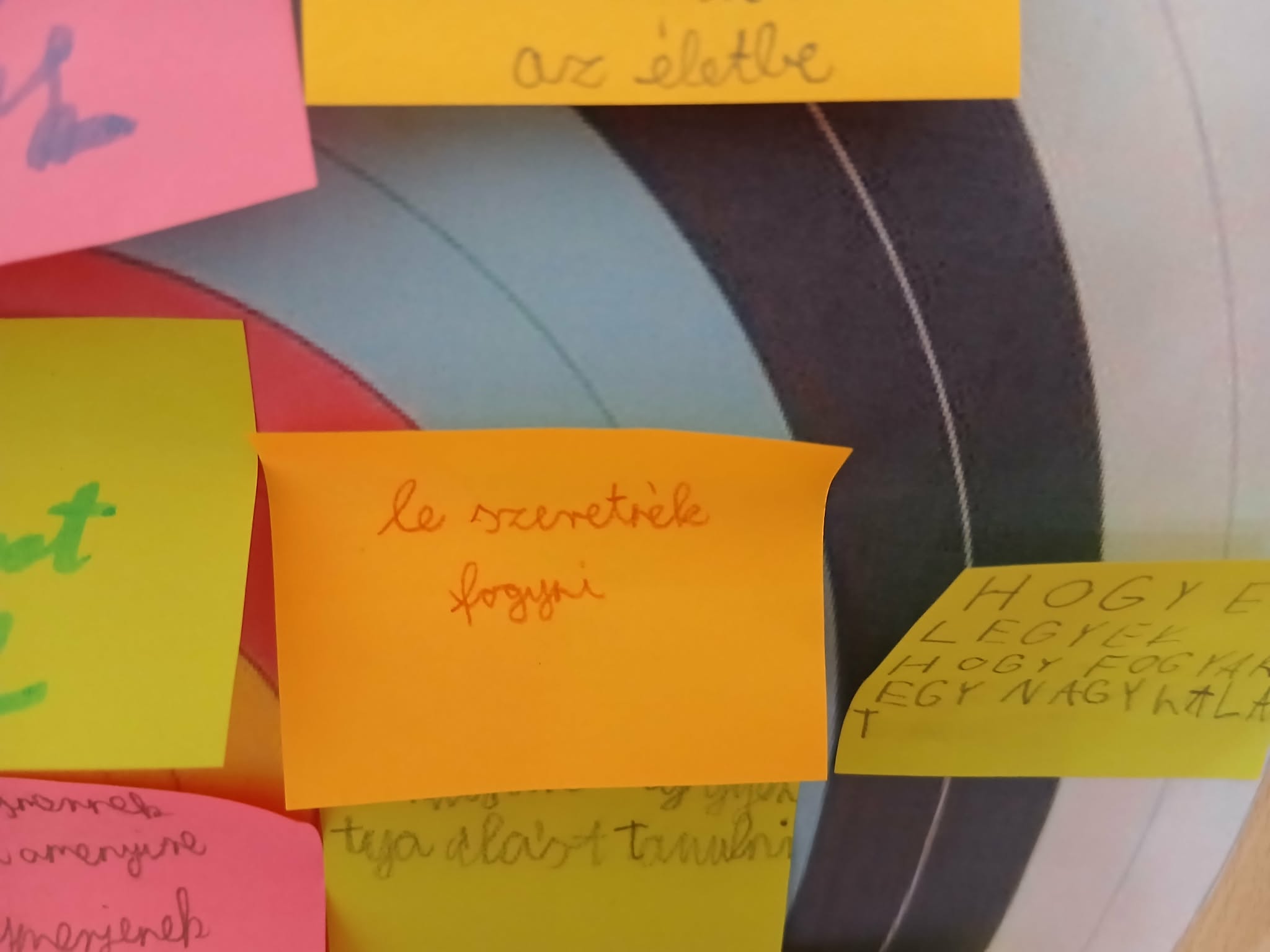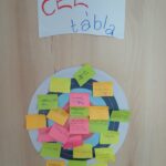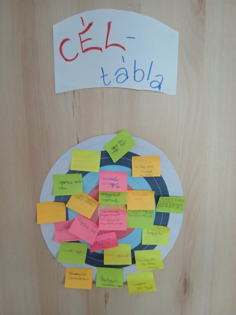 A történet után kihelyezett céltáblára összegyűjtöttük a gyerekek céljait. Ragadós, színes papírra írták őket, majd kirakták a céltáblára.