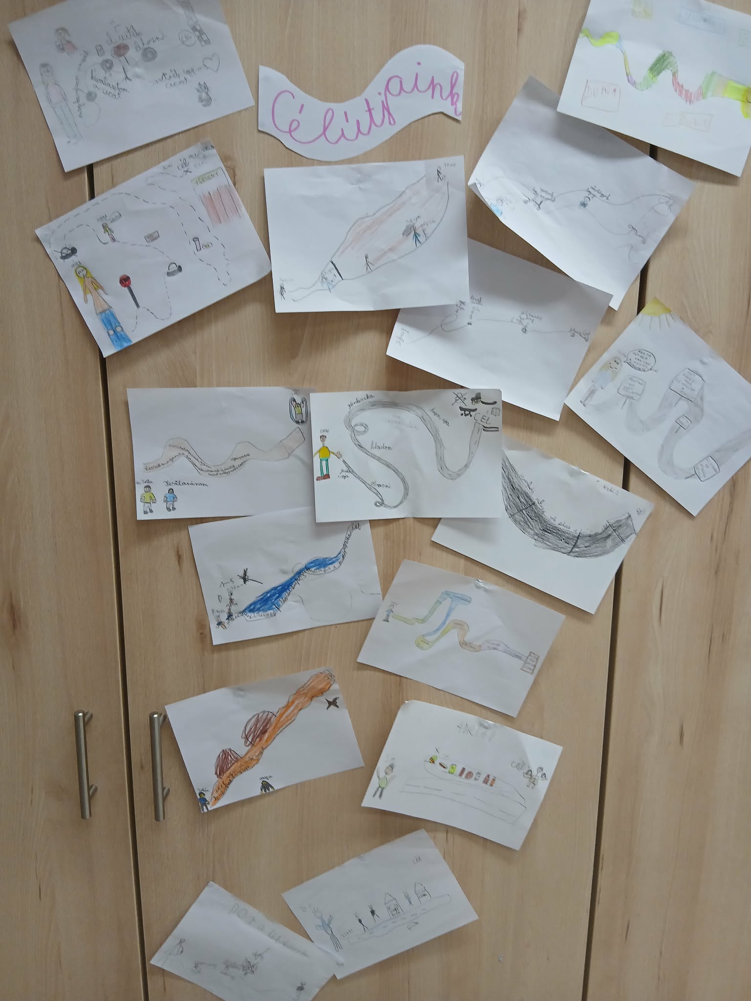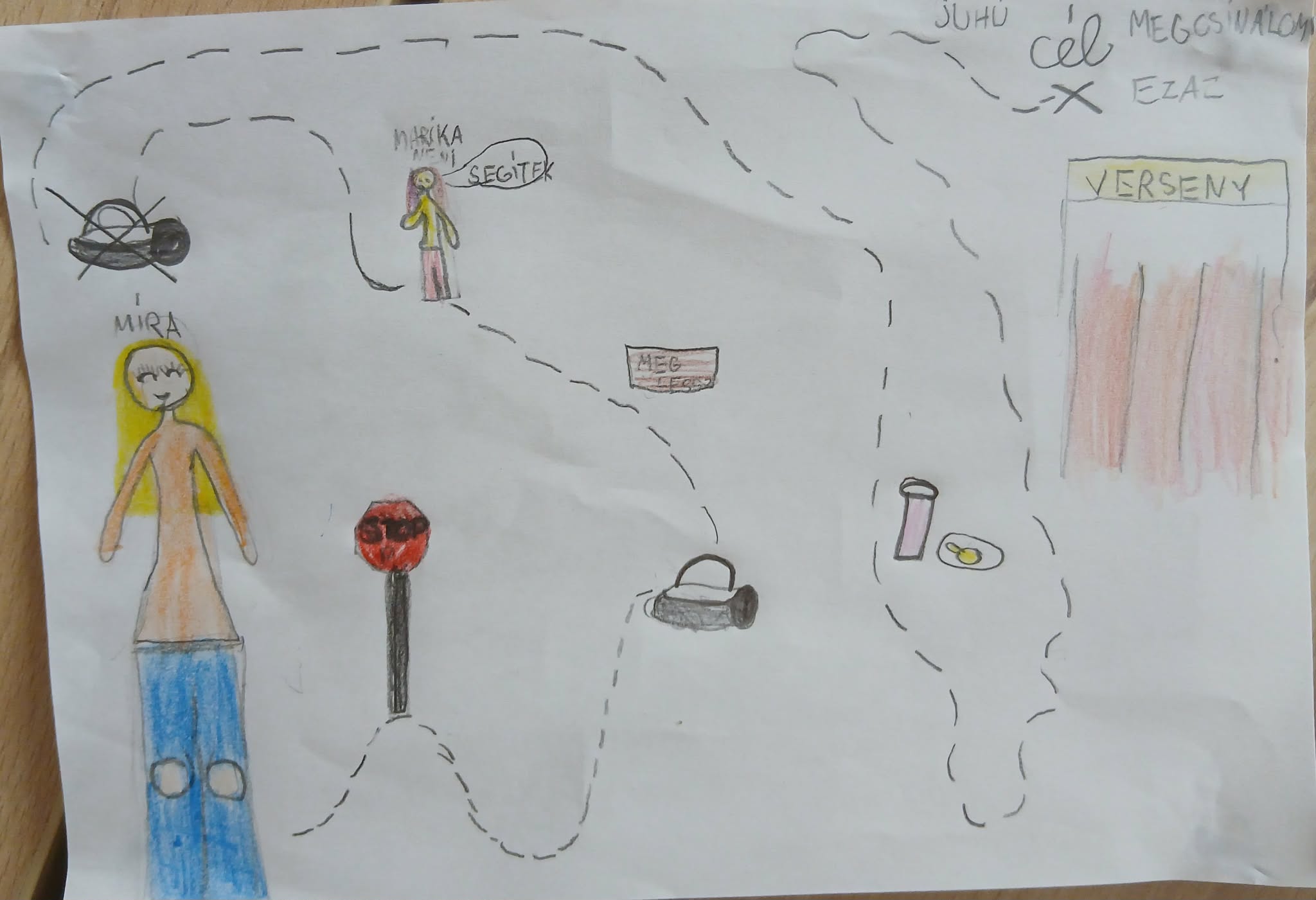 Kreatív feladatként megrajzolták a „célútjukat”. A lap baloldalára rajzolták önmagukat. A jobb oldalára az elérendő céljukat. A kettő közé kanyargós utat kellett rajzolni, amire 3-5 olyan „lépést” kellett megfogalmazni, vagy rajzolni, amit tesznek a cél érdekében. Az útra 1-2 akadályt is el kellett helyezni, ami nehezítette a dolgukat. Maguk mellé egy segítőt kellett rajzolniuk, akik segítették őket a cél megvalósításában.