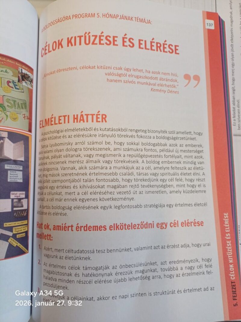 A boldogságóra program hetedik osztályos foglalkozásán január hónapban a célok kitűzése és elérése állt a középpontban. A tanulók megismerkedtek a reális és személyes célok megfogalmazásának fontosságával, valamint azzal, hogyan lehet a nagyobb célokat kisebb, megvalósítható lépésekre bontani. Beszélgetések, játékos feladatok és önreflexiós gyakorlatok segítségével erősödött az önismeretük, kitartásuk és felelősségvállalásuk. A program hozzájárult ahhoz, hogy tudatosabban tervezzék a jövőjüket, és magabiztosabban haladjanak saját céljaik megvalósítása felé.