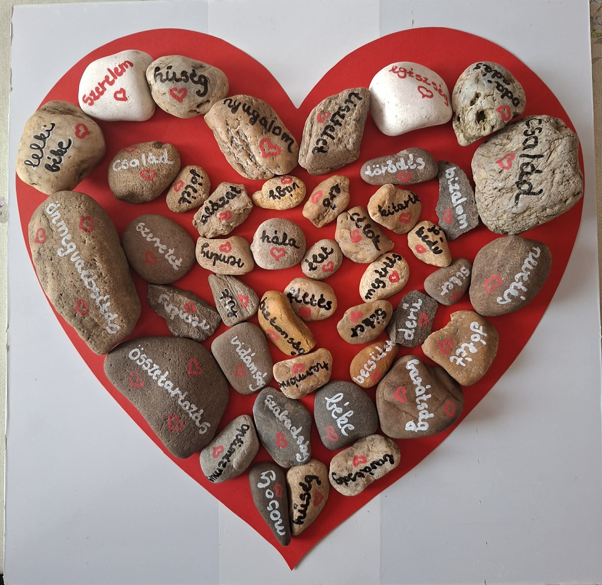 A folyosó félhomályában úszó szívecskék és a halk zene együtt különleges, meghitt, szívet melengető légkört teremtettek a szülők és a gyermekek számára már a reggeli megérkezés pillanatában. Ezt az élményt tovább gazdagította a saját kavics kiválasztásának lehetősége.