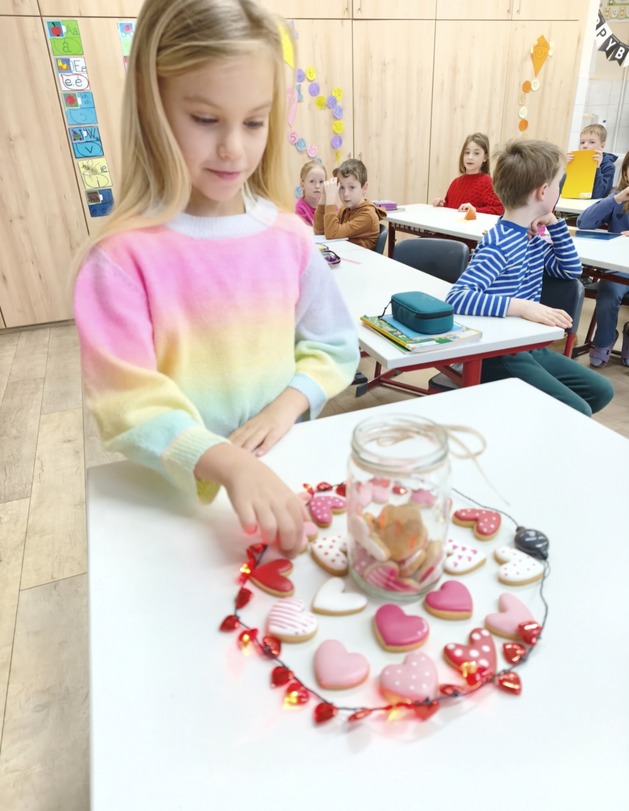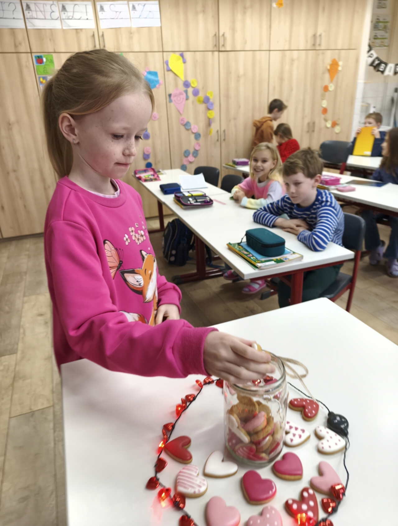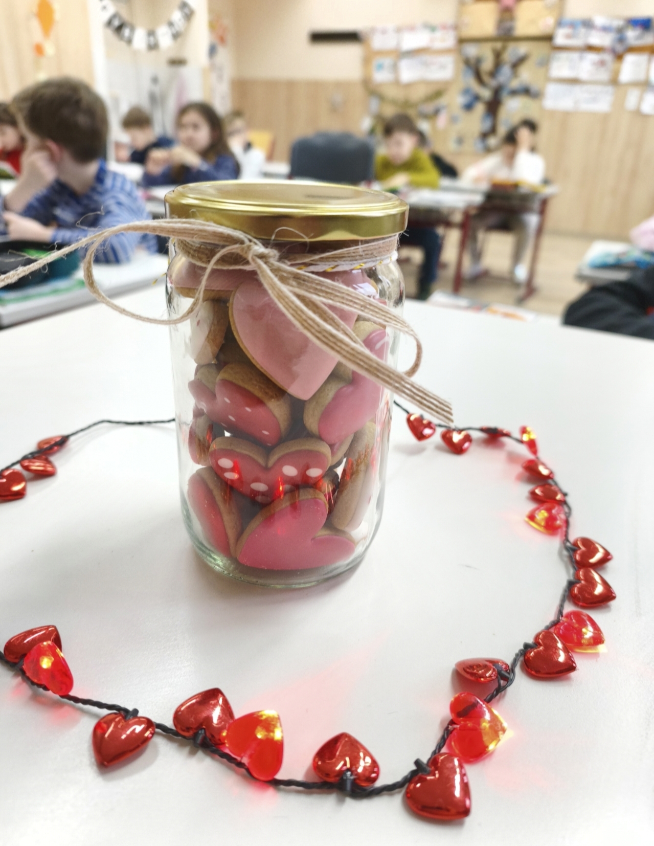 A beszélgetés után kreatív feladat következett. Kis szív alakú mézeskalácsokat készítettünk, amelyek az örömöt és a szeretetet jelképezték. Ezeket a szíveket egy közös üvegbe helyeztük, így készült el a mi „szeretetbefőttünk”.