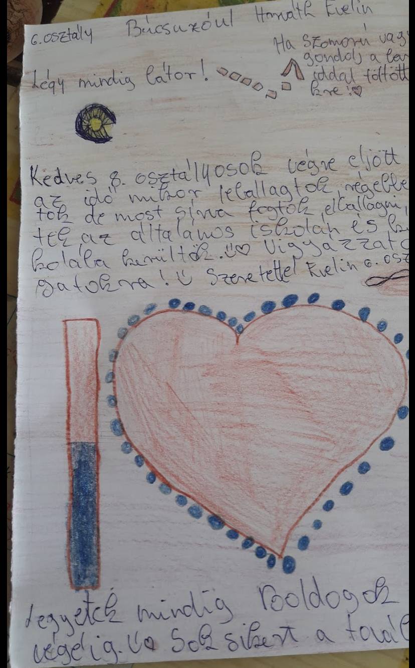 A Hatodik osztályosok a nyolcadik osztályosainknak készítettek búcsú ajándékként jó kívánságokat tartalmazó üzeneteket rajzokkal, amit a ballagás előtti napon át is adtak a számukra. Ezekből az üzenetekből a pozitív érzés, a szeretet sugároz, az a lelki harmónia, amit a tanév során mi magunk is kaptunk a Boldogság órák kapcsán. A legjobbakat kívántuk a nyolcadikosoknak, jó utat, sikeres jövőt és, hogy ne felejtsenek el minket, ránk mindig számíthatnak, még, ha sajnos már nem is nap, mint nap fogunk találkozni is!
