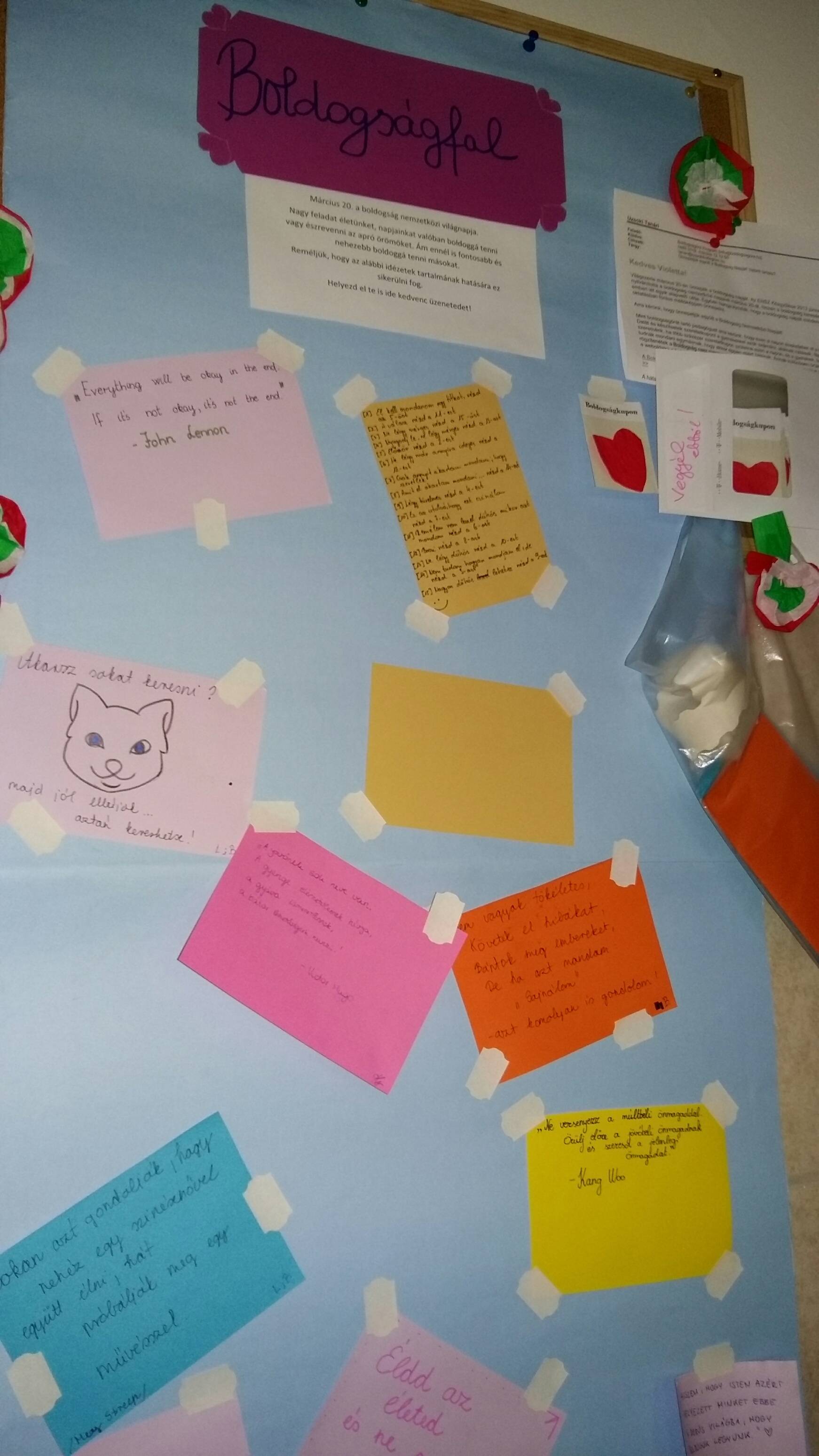 A boldogság nemzetközi világnapja alkalmából kollégiumunk ebben az évben is készült valami meglepetéssel. Boldogságfal készült, ahova mindenki felírt egy-egy pozitív, jóérzéseket keltő üzenetet vagy idézetet. Ezt a kartonlapot az ebédlőbe függesztettük fel, hogy mindenki lássa, és a diákok olvashassák egymás üzeneteit. Ezen a falon helyeztük el a szívecskés boldogságkuponokat is, amiket valakinek hálájuk kifejezésére odaadhatták. A boldogságfal és a kuponok kiindulópontjai egy jótékonysági láncreakciónak. Tégy jót valakivel és a címzett örül neki, a figyelmesség arra indítja, hogy ő is tegyen valami kedveset. A kedvesség gyakorlása boldogsághullámként terjed tovább. Reméljük, sikerül diákjainkat egy ilyen hullám érintésével önmaguknak és másoknak is még több szépet és jót cselekvőkké tenni.