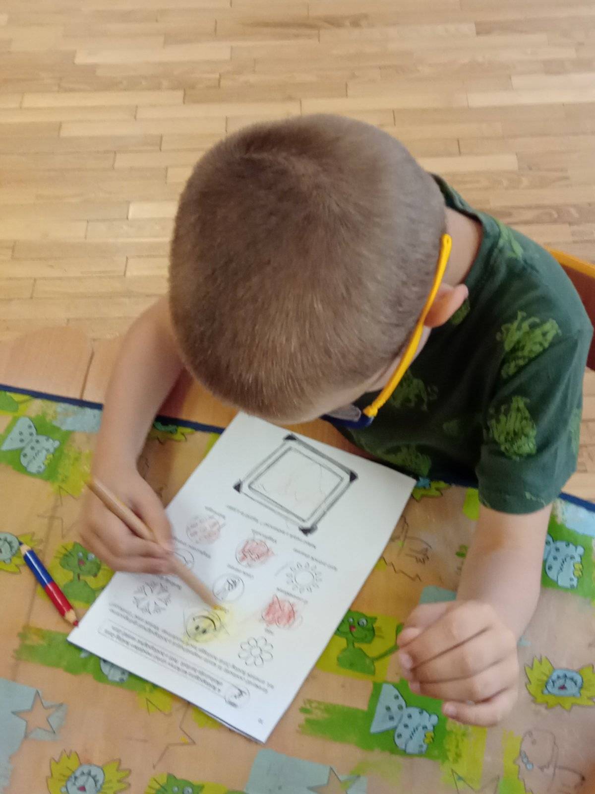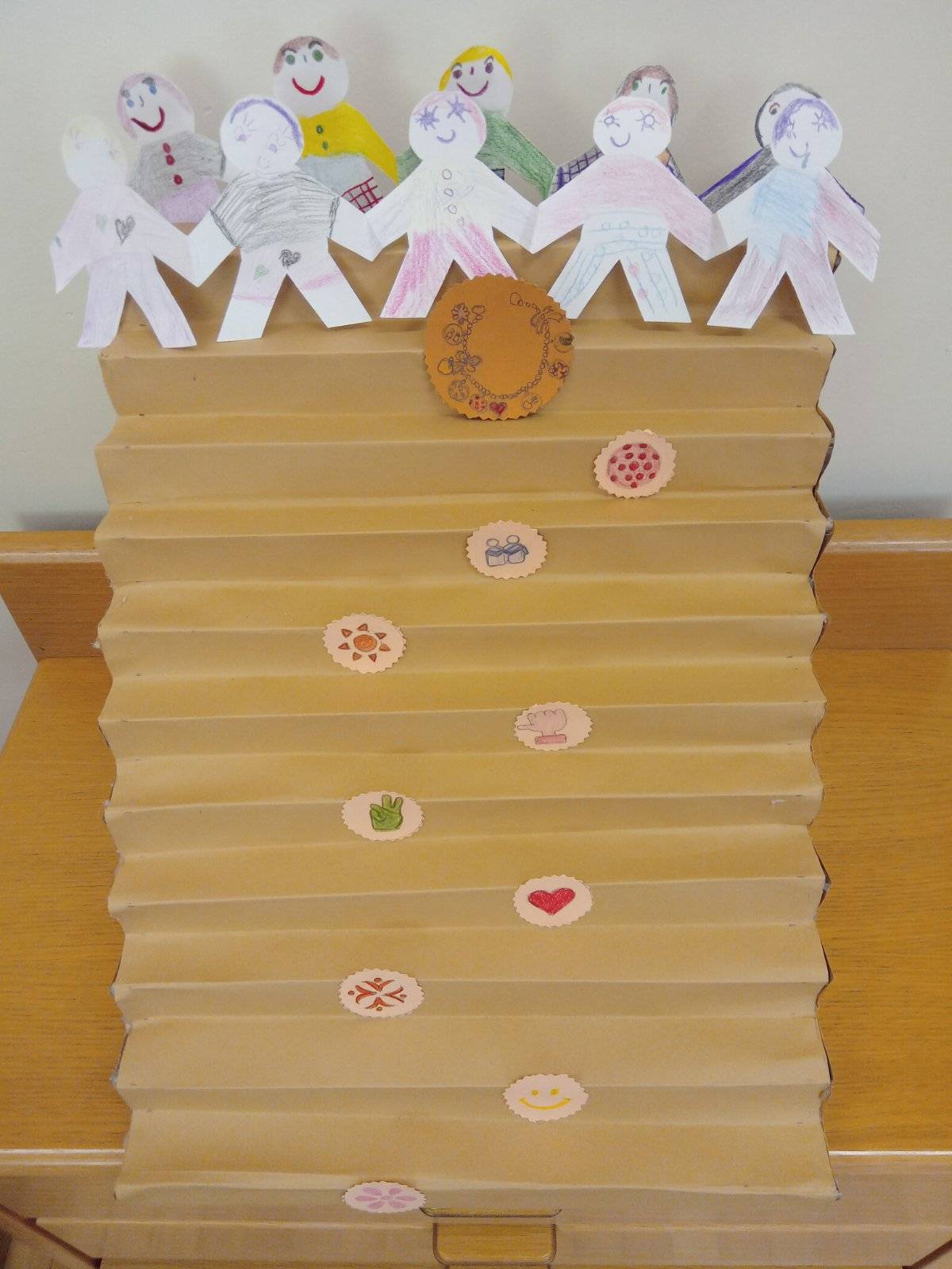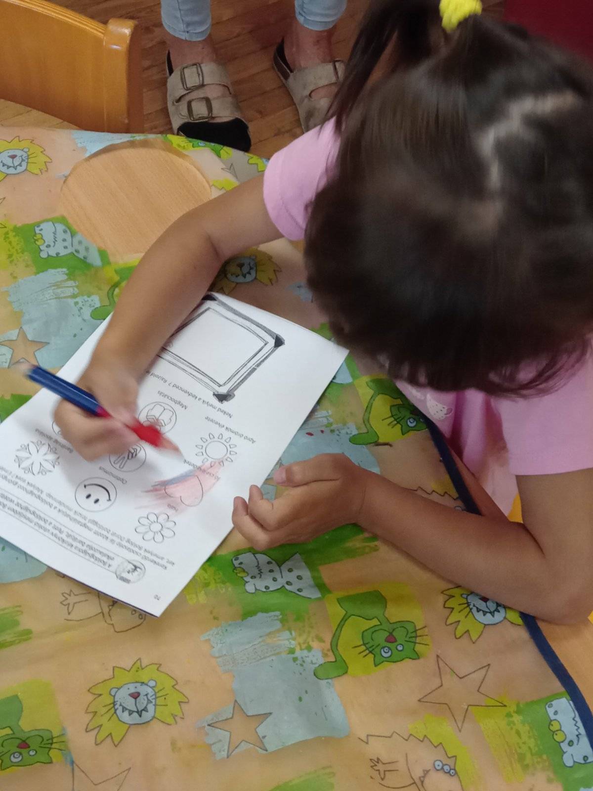 Az óvodai csoportomban egész évben, mint az aktuális hónapban is, törekedtem arra, hogy a gyermekek minél több pozitív élményben részesüljenek, legyenek segítőkészek társaikkal szemben, vegyék észre, ha valakinek segítségre van szüksége. Szeretetteljes, nyugodt légkörben, legyenek elégedettek, az öröm, a kíváncsiság, az energia, az élénkség jellemezze őket. Legyenek boldogok. A téma feldolgozását az „Irkafirka”, és a „Fújj, fújj” relaxációs gyakorlattal indítottuk, majd Bagdi Bella: Jobb veled a világ című dalát hallgattuk meg. A gyermekek lelkesen, boldogan táncoltak a zene hallatán, és próbálták énekelni a dalt. Ezután „szeretetkört” játszottunk. A kör középén álló gyermekről kedves tulajdonságokat mondtunk. A játékban mindenki sorra került. A mesét a „Kerekerdő…” kezdetű mondókával kezdeményeztem, melyet a gyermekek képességeire való tekintettel leegyszerűsítettem. A mese hangulata megalapozta, hogy a boldogságfokozó technikák jeleit, örömmel színezzék ki a gyermekek. Elkészítettük a boldogságfüzért. A foglalkozás zárásaként ölelésláncot játszottunk, körben állva a gyermekek a tőlük balra helyezkedő társukat megölelték.