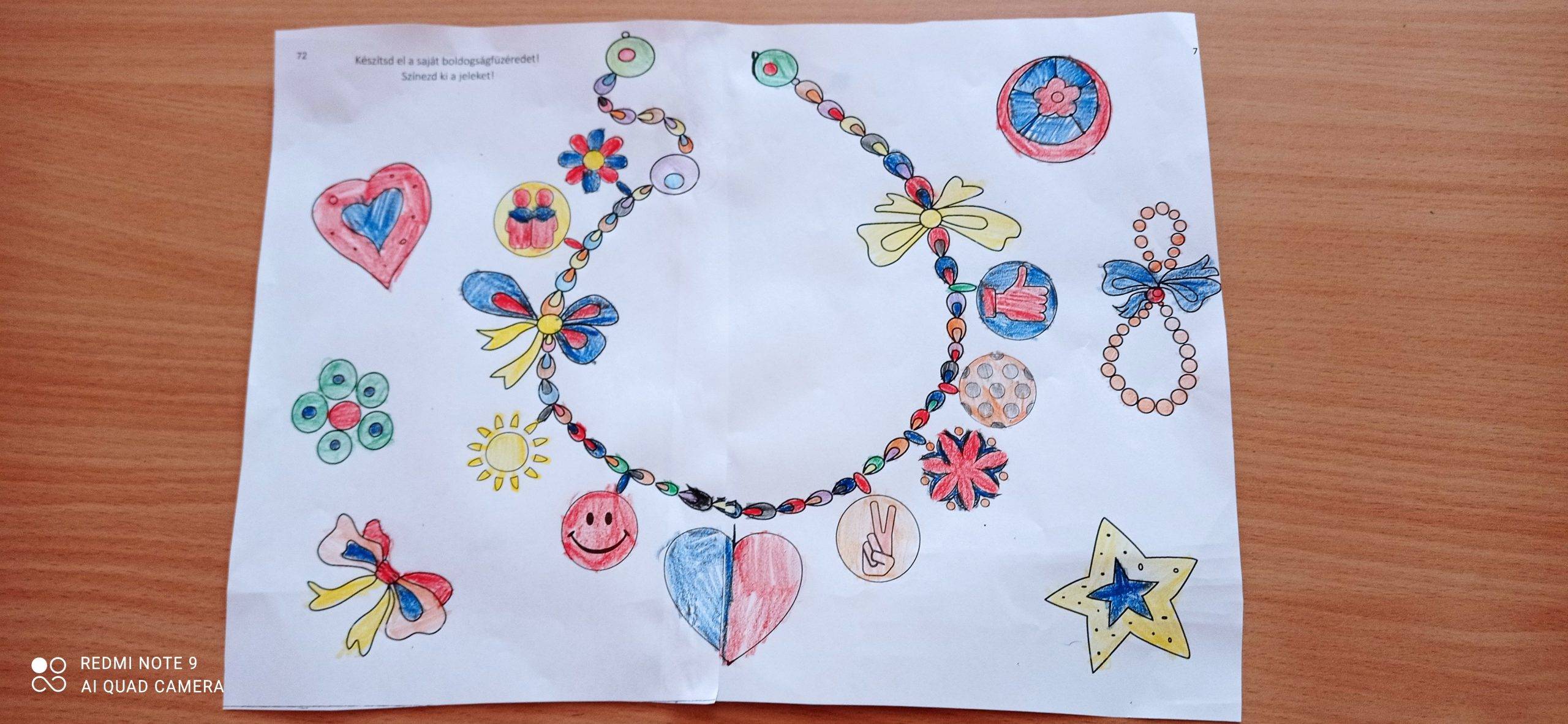 Az óvodai csoportomban egész évben, mint az aktuális hónapban is, törekedtem arra, hogy a gyermekek minél több pozitív élményben részesüljenek, legyenek segítőkészek társaikkal szemben, vegyék észre, ha valakinek segítségre van szüksége. Szeretetteljes, nyugodt légkörben, legyenek elégedettek, az öröm, a kíváncsiság, az energia, az élénkség jellemezze őket. Legyenek boldogok. A téma feldolgozását az „Irkafirka”, és a „Fújj, fújj” relaxációs gyakorlattal indítottuk, majd Bagdi Bella: Jobb veled a világ című dalát hallgattuk meg. A gyermekek lelkesen, boldogan táncoltak a zene hallatán, és próbálták énekelni a dalt. Ezután „szeretetkört” játszottunk. A kör középén álló gyermekről kedves tulajdonságokat mondtunk. A játékban mindenki sorra került. A mesét a „Kerekerdő…” kezdetű mondókával kezdeményeztem, melyet a gyermekek képességeire való tekintettel leegyszerűsítettem. A mese hangulata megalapozta, hogy a boldogságfokozó technikák jeleit, örömmel színezzék ki a gyermekek. Elkészítettük a boldogságfüzért. A foglalkozás zárásaként ölelésláncot játszottunk, körben állva a gyermekek a tőlük balra helyezkedő társukat megölelték.