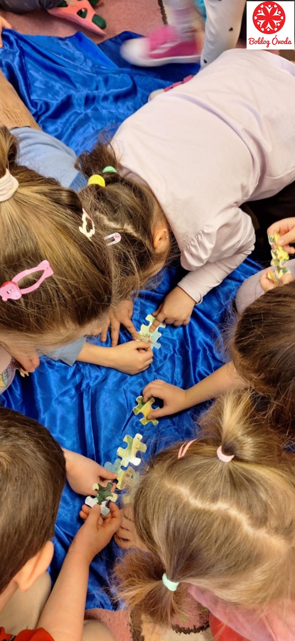 Az óvoda különböző helységeit lefényképeztem és kinyomtattam, majd puzzle képeket csináltam belőlük, amiket elhelyeztem egy- egy borítékba. Ezeket a borítékokat eldugtam minden olyan helyiségbe, ahova az utunk vezetni fog. A borítékok nemcsak a következő helységet tartalmazták, hanem egy-egy kérdést is, ami a mesére vezetett vissza. Például: hogy hívták a boszorkányt, vagy milyen mondókát mondott János, amikor egy akadály elé ért. Ha ezekre a kérdésekre helyesen válaszoltak, akkor a Boldogvár egy-egy darabkáját kapták meg jutalmul. 12 borítékunk volt, 12 kérdéssel és 12 puzzle darabkával. Az útvonalat lábnyomokkal jelöltem ki és megkértem a kedves kollegáimat, hogy vigyázzanak ezekre a nyomokra, amikor mennek ki az udvarra, mert a tappancsok vezetnek el minket a célunkhoz. A szabályokat érthetően elmondtam, megértették a kisgyermekek és bele is vágtunk a nagy kalandunkba. Szinte az egész délelőttöt eltöltöttük a darabkák keresésével és sikerült is mind a 12-t megtalálniuk. A célunk a Boldogvárba való bejutás volt és ahhoz, hogy ezt a célt elkérjük teljesítenünk kellett a feladatokat ugyanúgy, mint a mesében szereplő Jánosnak. Izgalmas volt a keresés, izgalmas volt azt is látni, hogy mennyire tudnak küzdeni, mennyire figyelnek a mesében lévő részletekre és okosan válaszolni a kérdésekre. Amikor meglett minden darabka, kirakták a Boldogvárat és ezzel bebocsátást nyertek oda. Ezt követően kiszínezték a célok elérésének a jelét, kitették az ötödik lépcsőfokra, majd visszamentek az asztalokhoz és lerajzolták, hogy kinek mi a célja, amit ez előtt megbeszéltünk. Nagyon jól sikerült rajzok lettek. Ezeket a rajzokat haza is vihették és mesélhettek a nagy kalandunkról is otthon. Zárásképpen kérték, hogy énekeljük el a „Van nekem egy álmom” és a „Pozitív gyerek vagyok” című dalokat. A kimerítő napunkat egy jól megérdemelt ebéddel zártuk, az elalvásukat és a nyugalmukat a hangtálak rezgései és hangjai biztosították. Talán még soha nem aludtak ilyen mélyen és nyugodtan! 😊