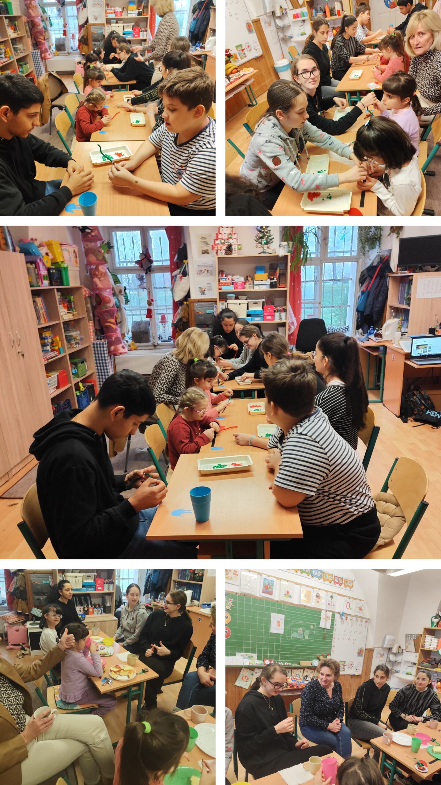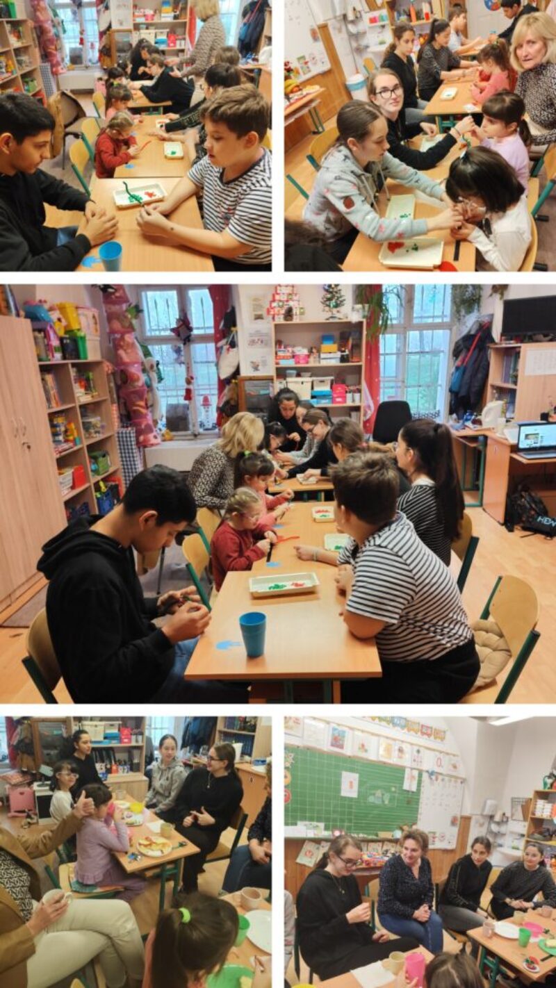 Hónapunk kiemelt boldogság órája az iskolánkban meghirdetett „Szeretet átölel” című feladat köré szerveztem. A DÖK által meghirdetett programban a feladat: vendégül látni iskolánk 1 választott (húzott) osztályát. A 8. TANAK osztályt húztuk, akiket közös verseléssel, dalolással, tánccal vártunk. Majd párban fűztek karácsonyfadíszt, melyet odaajándékoztunk a vendégeknek. A közös teázás, sütizés, gyümölcs evés közben pedig játszottunk az „5 másodperc” nevű játékkal, közben nagyokat nevettünk a hirtelen jött válaszokon. A vendégfogadás végeztével beszélgettünk róla, hogy milyen öröm volt adni: közös élményt-táncot, kreatív díszt, játékot, sok apró ölelést, odabújást. Nagyon kedves, meghitt pillanatokat éltünk meg mindannyian.
