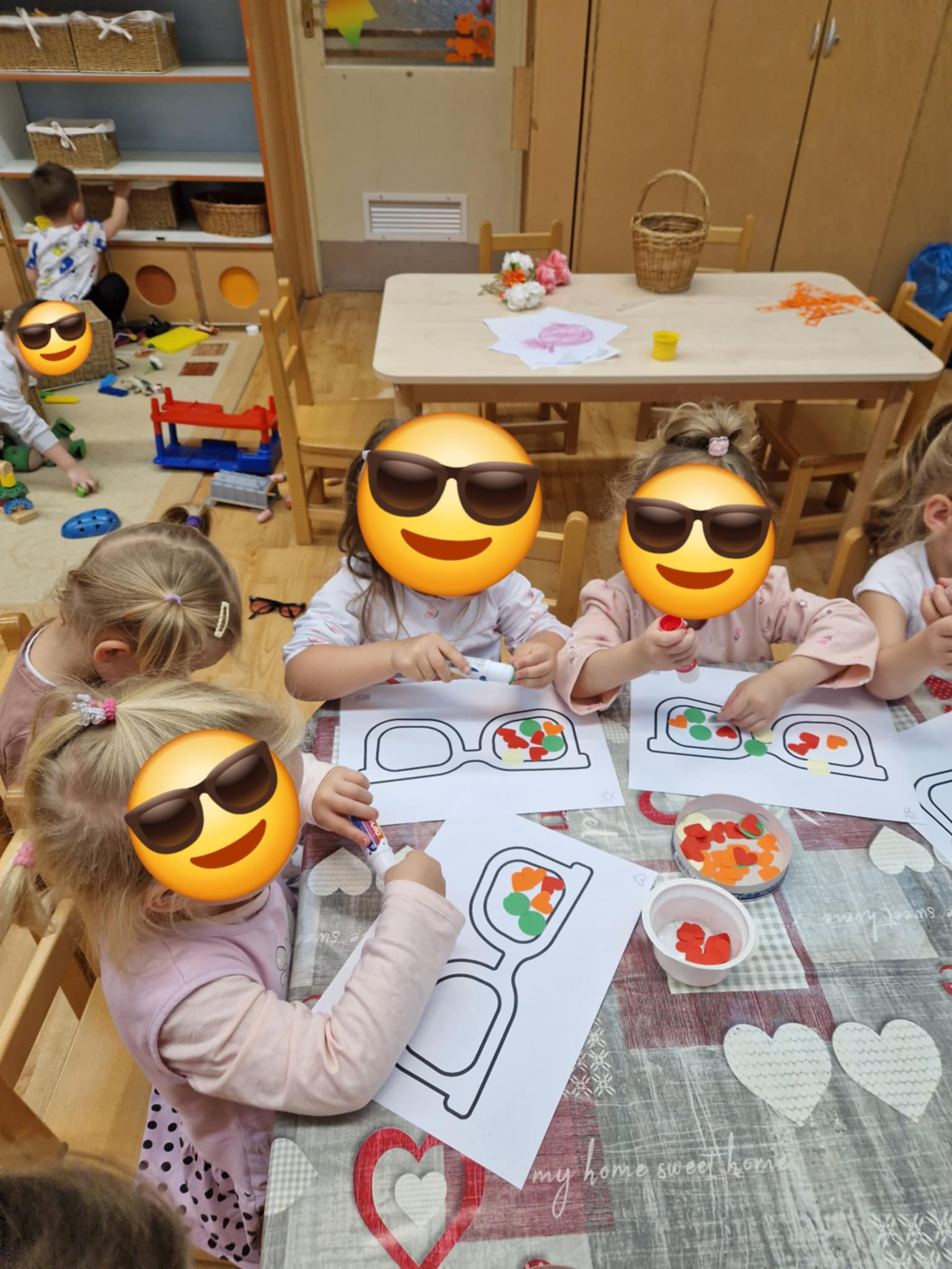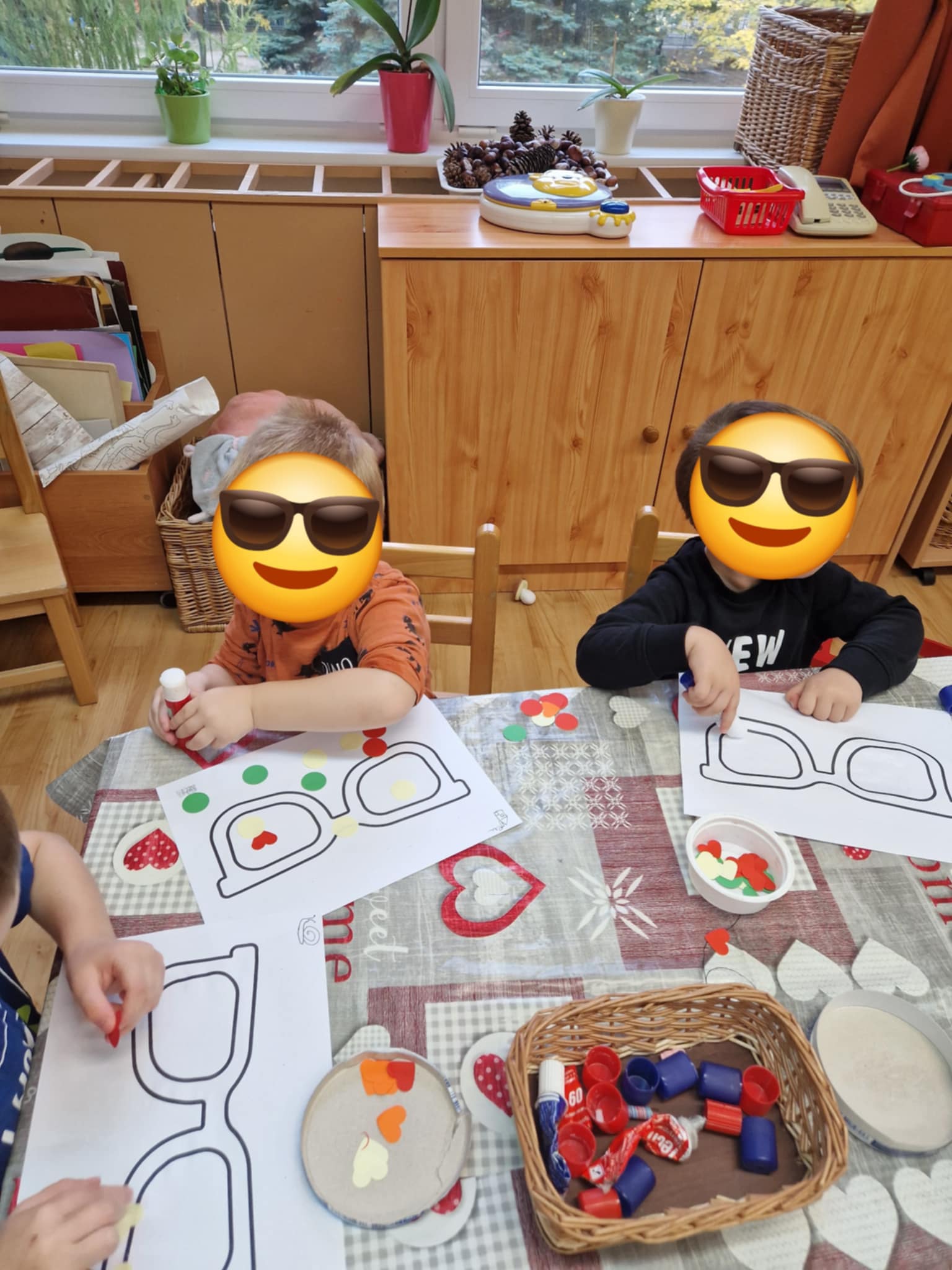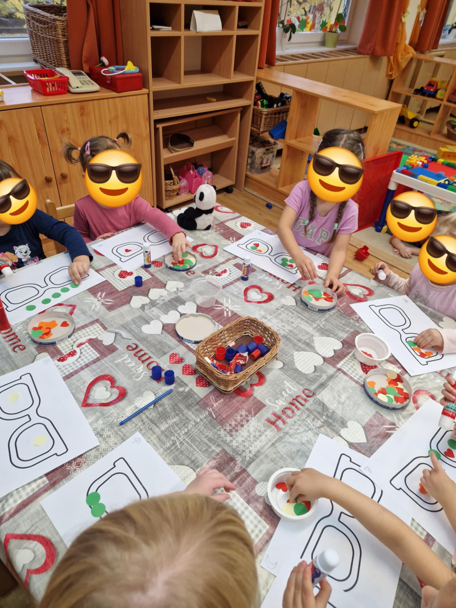 A bábok segítségével eljátszottam nekik a könyvben szereplő történetet (Tódi törpe varázsszemüvege). A gyerekek nagy figyelemmel hallgatták. A mese végén a bábokat kézbe vehették, saját hangjukon megszólaltatták. Megkérdeztem, hogy lenne-e kedve valakinek saját varázsszemüveget készíteni. A mesét így vizuális tevékenységbe vezettem át. Nagy érdeklődéssel ültek le az asztal mellé. Előre nyomtatott szemüveges képeket helyeztem ki az asztalokra. Előre kivágott többféle színű szívekkel lehetett díszíteni ragasztás technikával. Igazán különleges varázsszemüvegek készültek, melyeket később felvettünk (arcunk elé helyeztük) és elmondtuk, hogy milyen dolgokat látunk szépnek, milyen fontos, hogy a jót lássuk meg a másikban.