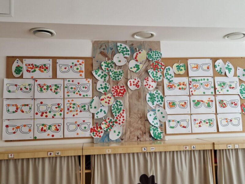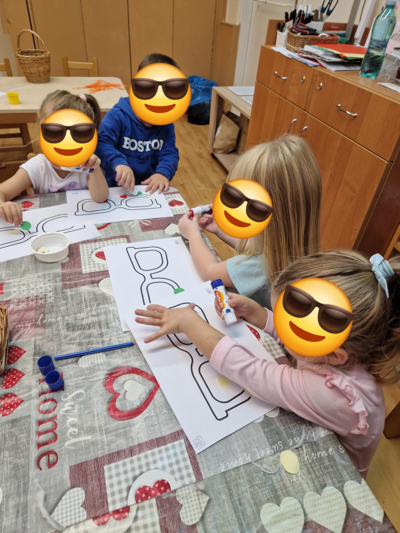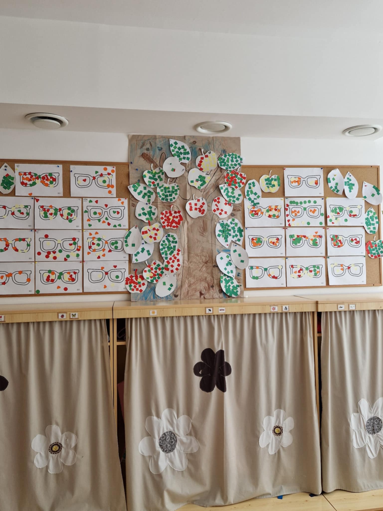 A bábok segítségével eljátszottam nekik a könyvben szereplő történetet (Tódi törpe varázsszemüvege). A gyerekek nagy figyelemmel hallgatták. A mese végén a bábokat kézbe vehették, saját hangjukon megszólaltatták. Megkérdeztem, hogy lenne-e kedve valakinek saját varázsszemüveget készíteni. A mesét így vizuális tevékenységbe vezettem át. Nagy érdeklődéssel ültek le az asztal mellé. Előre nyomtatott szemüveges képeket helyeztem ki az asztalokra. Előre kivágott többféle színű szívekkel lehetett díszíteni ragasztás technikával. Igazán különleges varázsszemüvegek készültek, melyeket később felvettünk (arcunk elé helyeztük) és elmondtuk, hogy milyen dolgokat látunk szépnek, milyen fontos, hogy a jót lássuk meg a másikban.