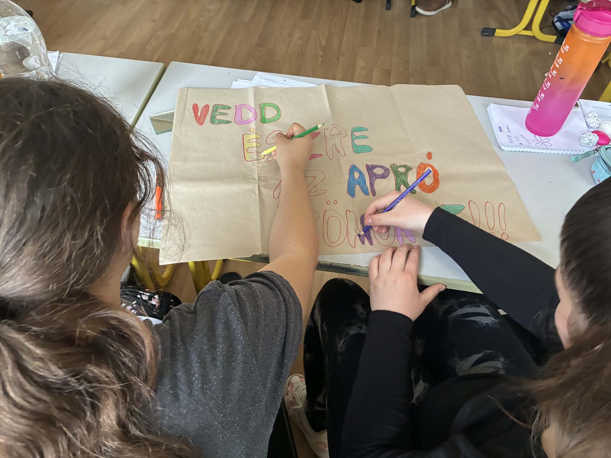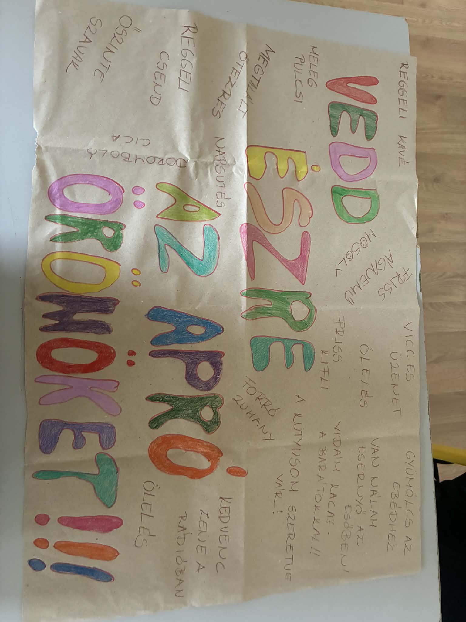 Az osztállyal ötletroham keretében összeszedtük azokat a mindennapi dolgokat, eseményeket, amelyek a hétköznapokban örömforrások lehetnek a számunkra. Miért, hogyan tudunk örülni? Miért jó nekünk a boldogsághormon? Az elkészült tablón ezek öltenek testet.