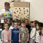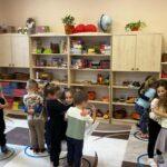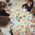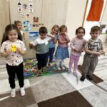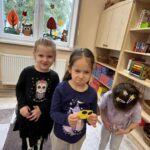 A mesemondáshoz megteremtettem a rendezett csoportszobát (Abrakadabra hipp és hopp, rakjunk rendet itt és most…), nyugodt légkört, ez idő alatt szólt Bagdi Bella optimizmusról szóló dala. A zene elhalkulása után mesére hívtam a gyerekeket (Egyszer régen, nagyon régen, kint jártam a meseréten, ahogy mentem, ahogy jártam…), addig mondtam, amíg mindenki leült a szőnyegre. Közben magamra kötöttem a mesekötényt és feltettem a süni fejdíszt. Bezzeg Andrea Tódi törpe varázsszemüvege című meséjét mondtam el a gyerekeknek. A mesét követően beszélgettünk Sün Artúrról, miért volt szomorú, mit kapott Tódi törpétől, hogy jó kedvre derüljön? Milyennek látta a világot? Szépnek, jónak, kedvesnek… Megkérdeztem a gyerekeket, hogy ők is voltak már szomorúak? Igen. Hiányzott anya, megütöttem a kezem, elestem a biciklivel, mérges voltam a barátomra, mert nem játszott velem stb…. Segített valaki, hogy jobb kedvetek legyen? A testvérem játszott velem, anya/ apa megpuszilt…. Mitől szép a világ? Sikerült egy nagy tornyot építenem és nem borult le, tudok az új gokarttal játszani az ovi udvarán, megtanultam hintázni, XY a barátom lett… Optimista, vidám, jókedvű mondatokat kaptam a gyerekektől. Nektek is jó lenne egy varázsszemüveg? Gyorsan színezünk egyet magunknak. Gyönyörű alkotások születek, színesek, vidámak, egyik 4 éves kislány belerajzolta a kutyusát, hogy viszik sétálni, a másik oldalba apukájával fürdőzni vannak, feldobja a medencében. Mindennapos mozgásunkba először a hangunkkal játszottunk a Mese-mese mátka mondókát, ha leguggoltunk halkan mondtuk, ha felálltunk hangosan mondtuk a sorokat. Először hangosan kezdtük, hogy a feszültség, szorongás oldódjon és a hangjuk kiengedésével izmaik, testük lazuljon, halkkal zártuk, hogy lenyugodjunk, lecsillapodjunk. Megtanultuk és elmutogattuk Tódi törpe Szebben látó mondókáját. Nagyon tetszett a gyerekeknek, azóta is többször mondjuk a csoportban. Megismerkedtek a gyerekek Szomorú Szilárddal és Boldog Blankával. Megmutatták ők is az érzelmeiket, hogyan szomorúak és hogyan jó kedvűek, vidámak, egymást is igyekeztünk felvidítani. Karikákat raktam le, ha a szomorú emojit mutattam futottak a csoportszobában, ha a mosolygós emojit gyorsan kerestek egy színes kört, összekapaszkodtak egy karikában többen is és boldogok voltak, hangosan kacagtak a játéktól. Együtt voltak, segítették egymást, öröm volt csatlakozni a társakhoz és öröm volt befogadni a csoporttársamat, barátomat. Boldogság, jó kedv járta át a gyerekeket játék közben.