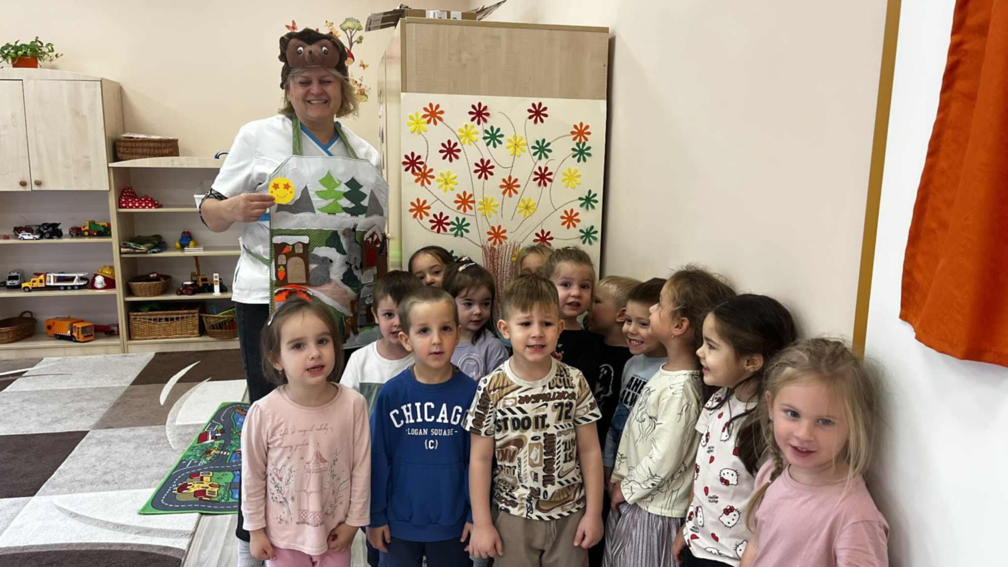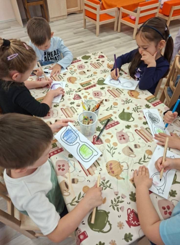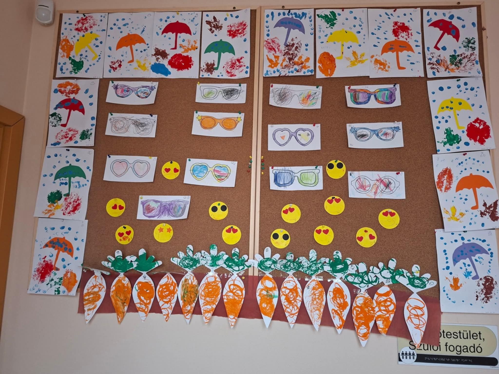 A mesemondáshoz megteremtettem a rendezett csoportszobát (Abrakadabra hipp és hopp, rakjunk rendet itt és most…), nyugodt légkört, ez idő alatt szólt Bagdi Bella optimizmusról szóló dala. A zene elhalkulása után mesére hívtam a gyerekeket (Egyszer régen, nagyon régen, kint jártam a meseréten, ahogy mentem, ahogy jártam…), addig mondtam, amíg mindenki leült a szőnyegre. Közben magamra kötöttem a mesekötényt és feltettem a süni fejdíszt. Bezzeg Andrea Tódi törpe varázsszemüvege című meséjét mondtam el a gyerekeknek. A mesét követően beszélgettünk Sün Artúrról, miért volt szomorú, mit kapott Tódi törpétől, hogy jó kedvre derüljön? Milyennek látta a világot? Szépnek, jónak, kedvesnek… Megkérdeztem a gyerekeket, hogy ők is voltak már szomorúak? Igen. Hiányzott anya, megütöttem a kezem, elestem a biciklivel, mérges voltam a barátomra, mert nem játszott velem stb…. Segített valaki, hogy jobb kedvetek legyen? A testvérem játszott velem, anya/ apa megpuszilt…. Mitől szép a világ? Sikerült egy nagy tornyot építenem és nem borult le, tudok az új gokarttal játszani az ovi udvarán, megtanultam hintázni, XY a barátom lett… Optimista, vidám, jókedvű mondatokat kaptam a gyerekektől. Nektek is jó lenne egy varázsszemüveg? Gyorsan színezünk egyet magunknak. Gyönyörű alkotások születek, színesek, vidámak, egyik 4 éves kislány belerajzolta a kutyusát, hogy viszik sétálni, a másik oldalba apukájával fürdőzni vannak, feldobja a medencében. Mindennapos mozgásunkba először a hangunkkal játszottunk a Mese-mese mátka mondókát, ha leguggoltunk halkan mondtuk, ha felálltunk hangosan mondtuk a sorokat. Először hangosan kezdtük, hogy a feszültség, szorongás oldódjon és a hangjuk kiengedésével izmaik, testük lazuljon, halkkal zártuk, hogy lenyugodjunk, lecsillapodjunk. Megtanultuk és elmutogattuk Tódi törpe Szebben látó mondókáját. Nagyon tetszett a gyerekeknek, azóta is többször mondjuk a csoportban. Megismerkedtek a gyerekek Szomorú Szilárddal és Boldog Blankával. Megmutatták ők is az érzelmeiket, hogyan szomorúak és hogyan jó kedvűek, vidámak, egymást is igyekeztünk felvidítani. Karikákat raktam le, ha a szomorú emojit mutattam futottak a csoportszobában, ha a mosolygós emojit gyorsan kerestek egy színes kört, összekapaszkodtak egy karikában többen is és boldogok voltak, hangosan kacagtak a játéktól. Együtt voltak, segítették egymást, öröm volt csatlakozni a társakhoz és öröm volt befogadni a csoporttársamat, barátomat. Boldogság, jó kedv járta át a gyerekeket játék közben.