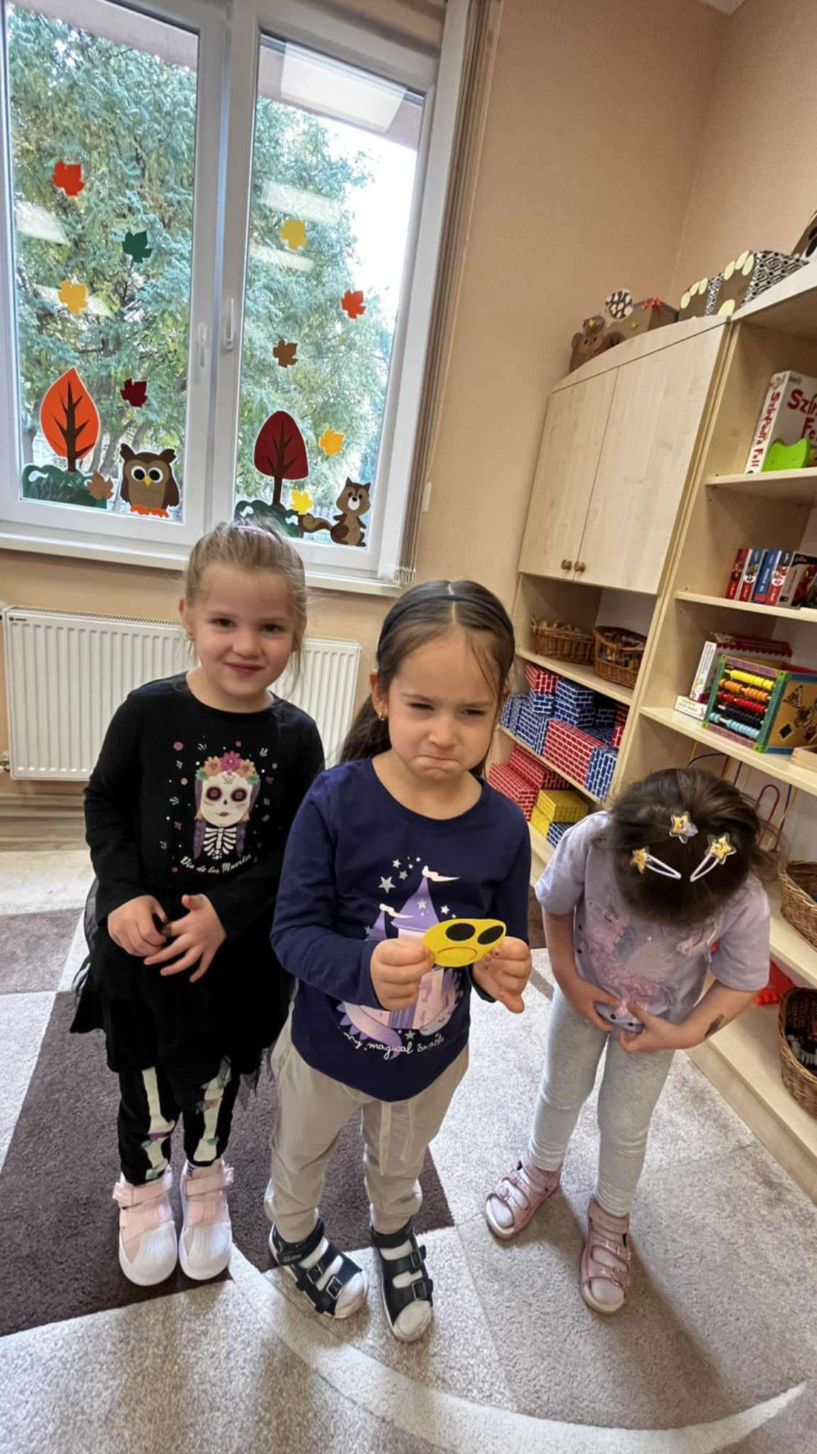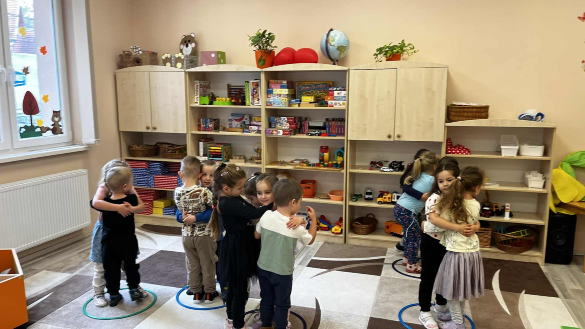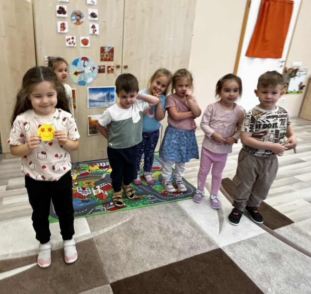 A mesemondáshoz megteremtettem a rendezett csoportszobát (Abrakadabra hipp és hopp, rakjunk rendet itt és most…), nyugodt légkört, ez idő alatt szólt Bagdi Bella optimizmusról szóló dala. A zene elhalkulása után mesére hívtam a gyerekeket (Egyszer régen, nagyon régen, kint jártam a meseréten, ahogy mentem, ahogy jártam…), addig mondtam, amíg mindenki leült a szőnyegre. Közben magamra kötöttem a mesekötényt és feltettem a süni fejdíszt. Bezzeg Andrea Tódi törpe varázsszemüvege című meséjét mondtam el a gyerekeknek. A mesét követően beszélgettünk Sün Artúrról, miért volt szomorú, mit kapott Tódi törpétől, hogy jó kedvre derüljön? Milyennek látta a világot? Szépnek, jónak, kedvesnek… Megkérdeztem a gyerekeket, hogy ők is voltak már szomorúak? Igen. Hiányzott anya, megütöttem a kezem, elestem a biciklivel, mérges voltam a barátomra, mert nem játszott velem stb…. Segített valaki, hogy jobb kedvetek legyen? A testvérem játszott velem, anya/ apa megpuszilt…. Mitől szép a világ? Sikerült egy nagy tornyot építenem és nem borult le, tudok az új gokarttal játszani az ovi udvarán, megtanultam hintázni, XY a barátom lett… Optimista, vidám, jókedvű mondatokat kaptam a gyerekektől. Nektek is jó lenne egy varázsszemüveg? Gyorsan színezünk egyet magunknak. Gyönyörű alkotások születek, színesek, vidámak, egyik 4 éves kislány belerajzolta a kutyusát, hogy viszik sétálni, a másik oldalba apukájával fürdőzni vannak, feldobja a medencében. Mindennapos mozgásunkba először a hangunkkal játszottunk a Mese-mese mátka mondókát, ha leguggoltunk halkan mondtuk, ha felálltunk hangosan mondtuk a sorokat. Először hangosan kezdtük, hogy a feszültség, szorongás oldódjon és a hangjuk kiengedésével izmaik, testük lazuljon, halkkal zártuk, hogy lenyugodjunk, lecsillapodjunk. Megtanultuk és elmutogattuk Tódi törpe Szebben látó mondókáját. Nagyon tetszett a gyerekeknek, azóta is többször mondjuk a csoportban. Megismerkedtek a gyerekek Szomorú Szilárddal és Boldog Blankával. Megmutatták ők is az érzelmeiket, hogyan szomorúak és hogyan jó kedvűek, vidámak, egymást is igyekeztünk felvidítani. Karikákat raktam le, ha a szomorú emojit mutattam futottak a csoportszobában, ha a mosolygós emojit gyorsan kerestek egy színes kört, összekapaszkodtak egy karikában többen is és boldogok voltak, hangosan kacagtak a játéktól. Együtt voltak, segítették egymást, öröm volt csatlakozni a társakhoz és öröm volt befogadni a csoporttársamat, barátomat. Boldogság, jó kedv járta át a gyerekeket játék közben.