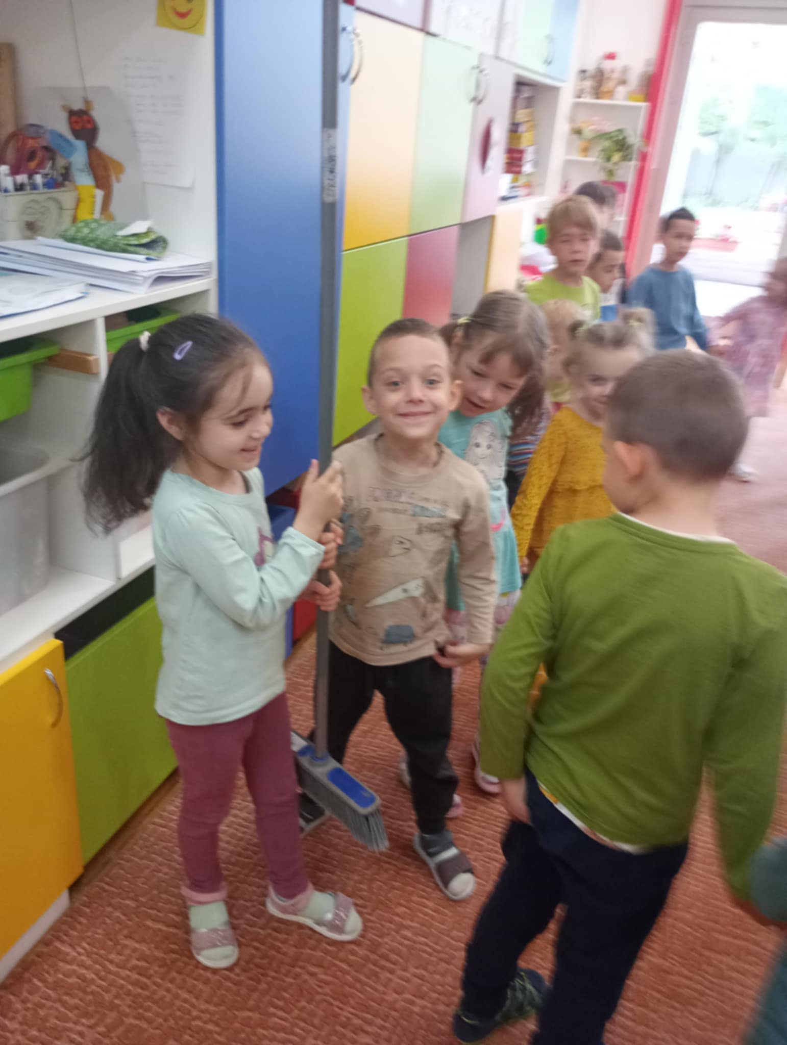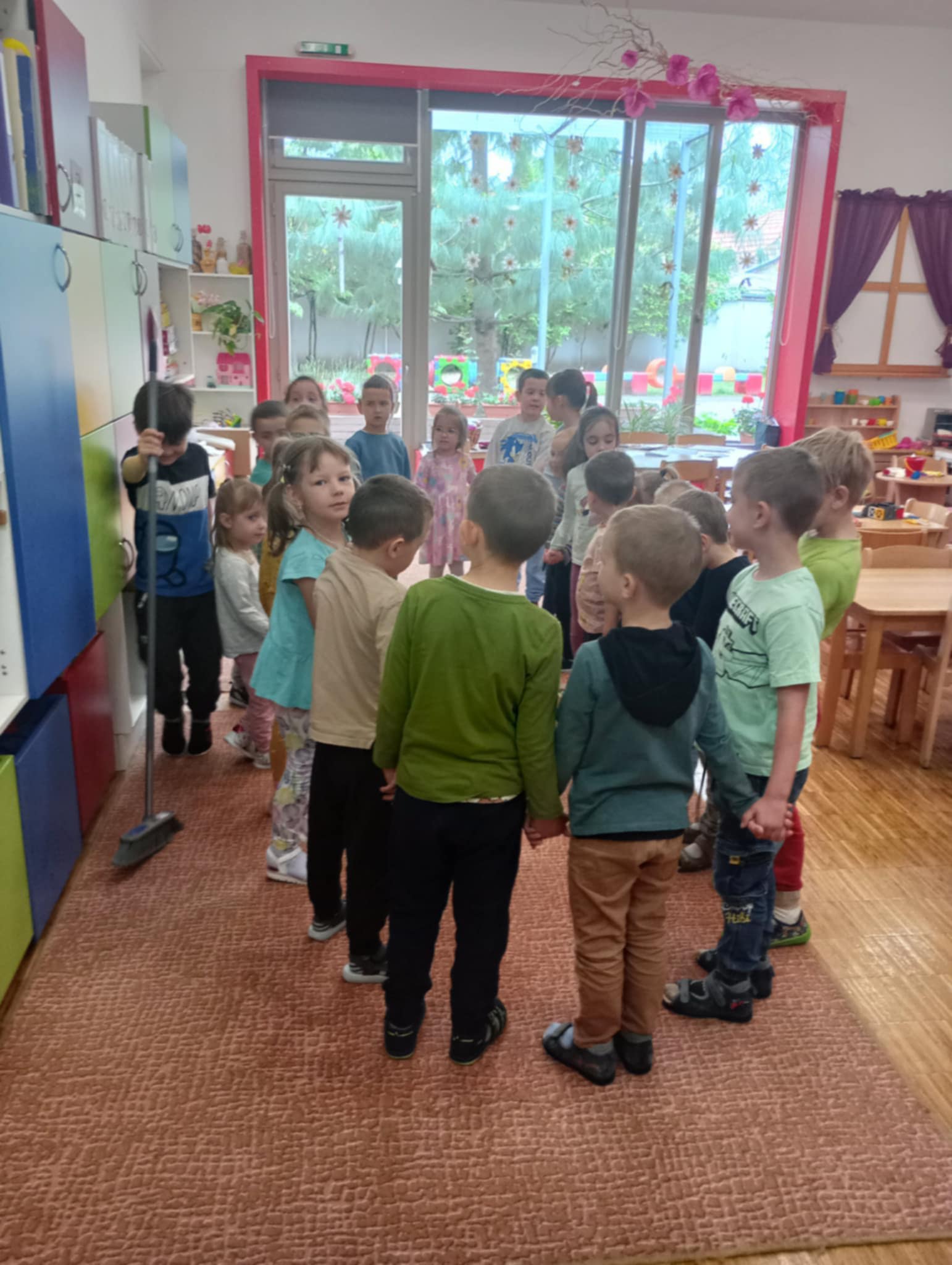 • Körben állnak a gyerekek, egy seprű (vagy bot) a körön kívül.