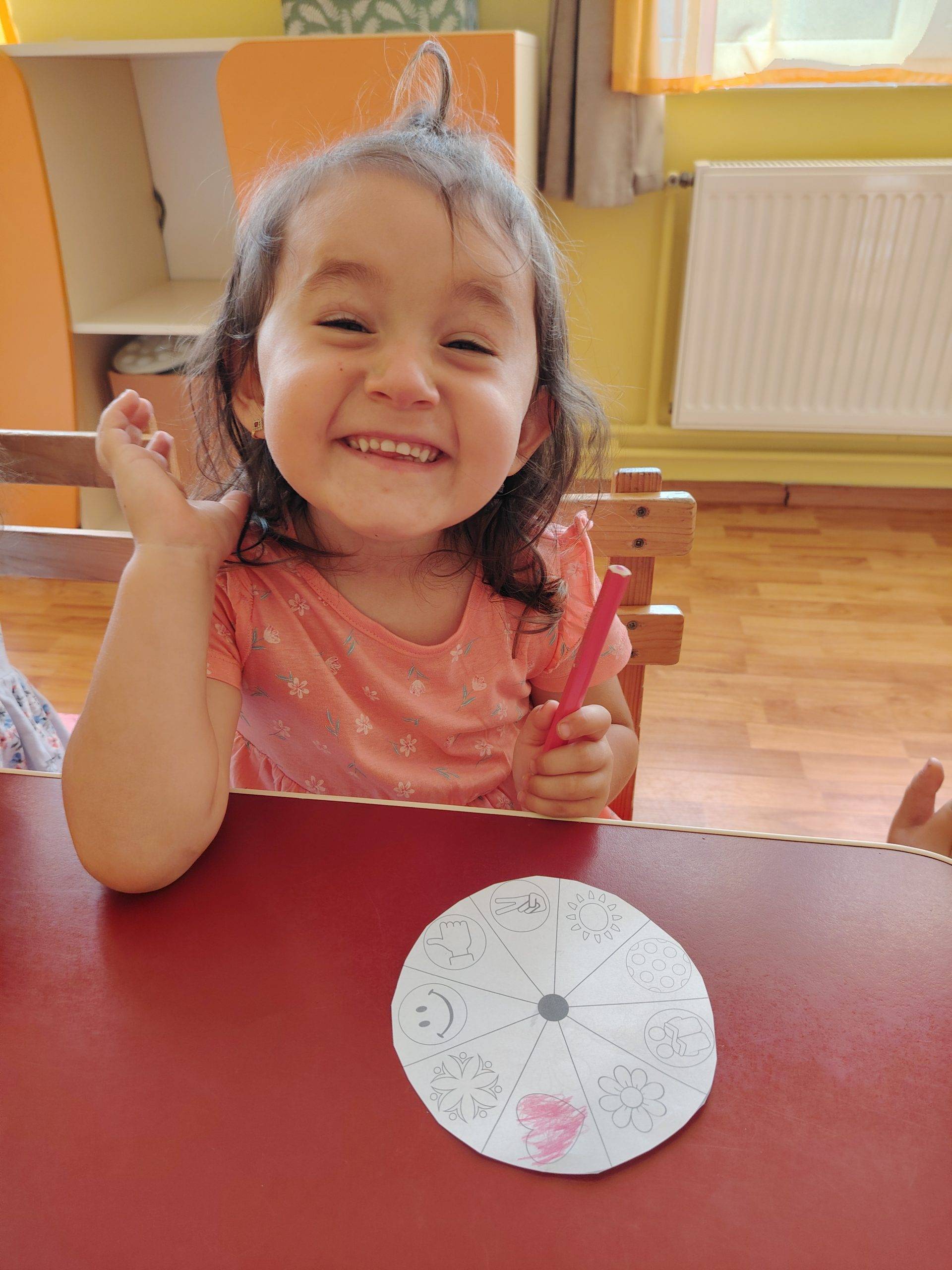 Ezt követte egy Boldogság virág készítése. Ha már Hála virággal kezdtük a legelején, akkor Boldogság virággal zártuk ezt a csodás tanévet. Ez egy nagyon különleges virág, amely különleges törődést igényel. A munkafüzet 71. oldalán lévő boldogság kereke képezi a közepét. Minden kis szimbólumok kiszíneztünk és megbeszéltünk. Megerősítettük magunkban azt, hogy mindig van miért hálásnak lenni, fontos a derűlátás, a barátokra figyelnünk kell, mert velük kerek a világ, amikor csak tudunk cselekedjünk jót, bizony a céljainkért küzdeni kell (volt aki azt mondta, nyáron megtanulni biciklizni, akkor is, ha sokszor elesik ), nem feladni, sok mindennek örülhetünk, megbocsátani jó és azt is eltökéltük, hogy sokat fogunk szaladgálni, labdázni, játszani.