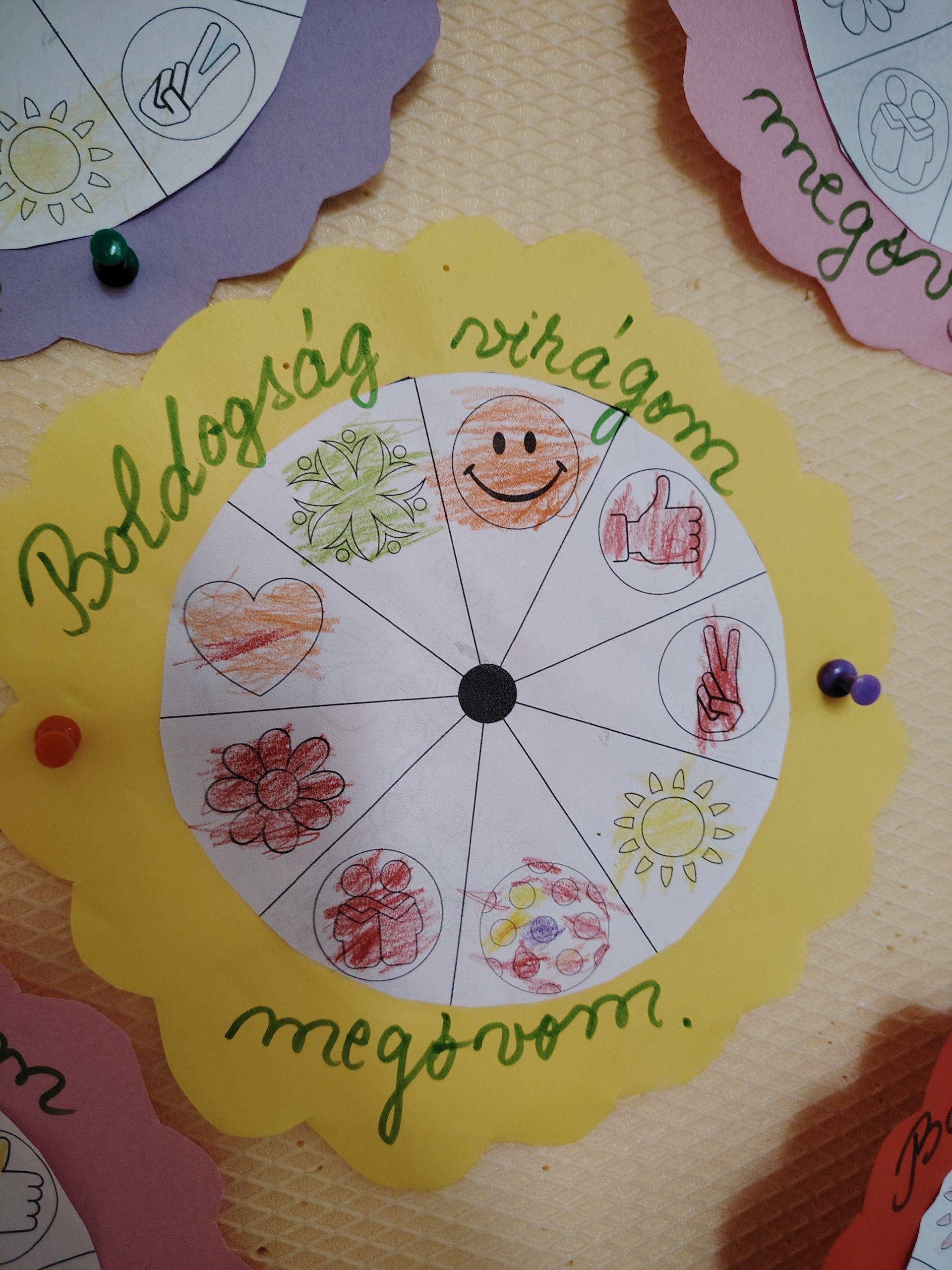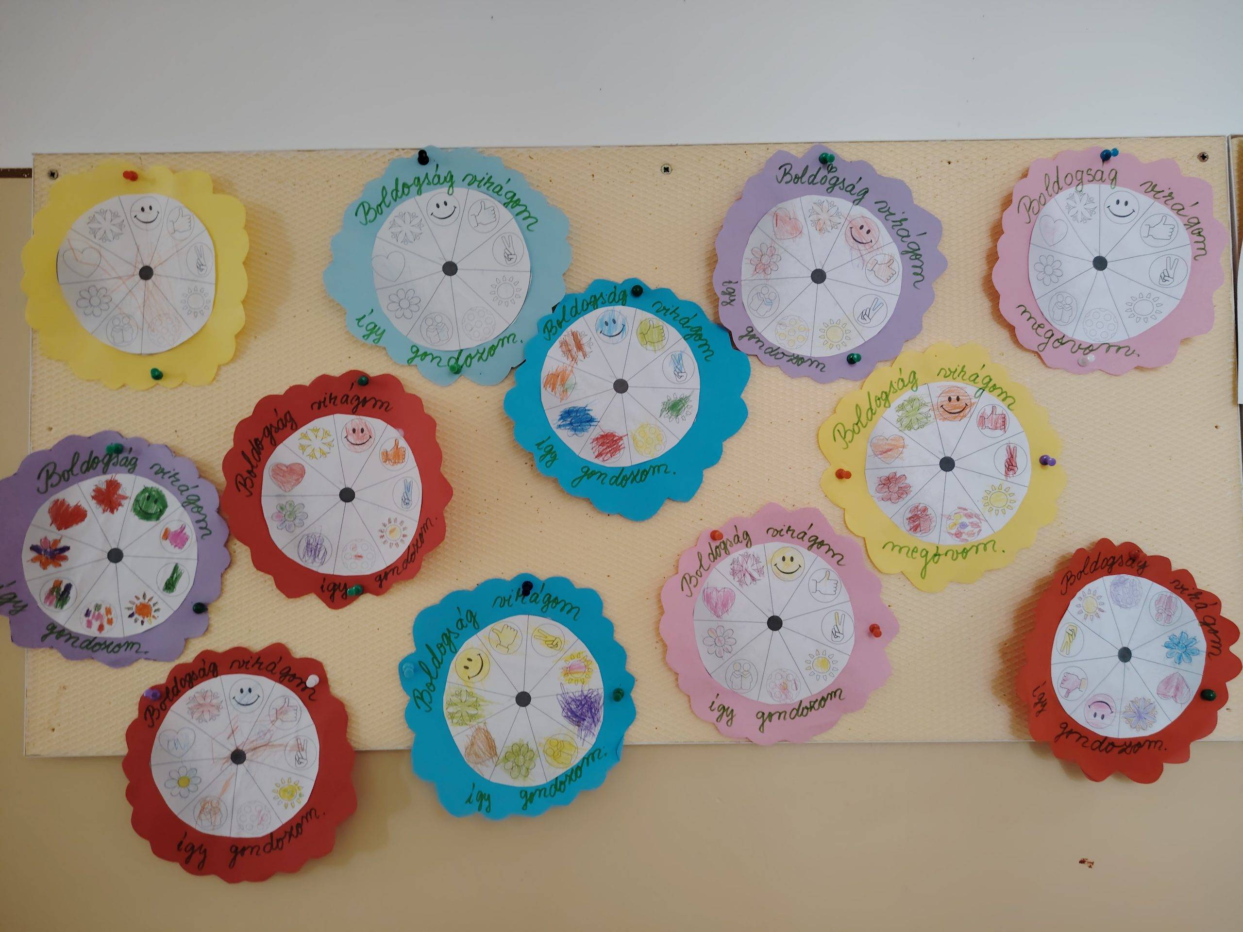 Az így kiszínezett kerék képezi a Boldogság virágunk közepét, melyet a gyerekek egy színes virágformára ragasztottak, melyen ez állt: Boldogság virágom így gondozom. Eztán következett a lakoma. Falalatozással zártuk le a boldogság órás tanévet.