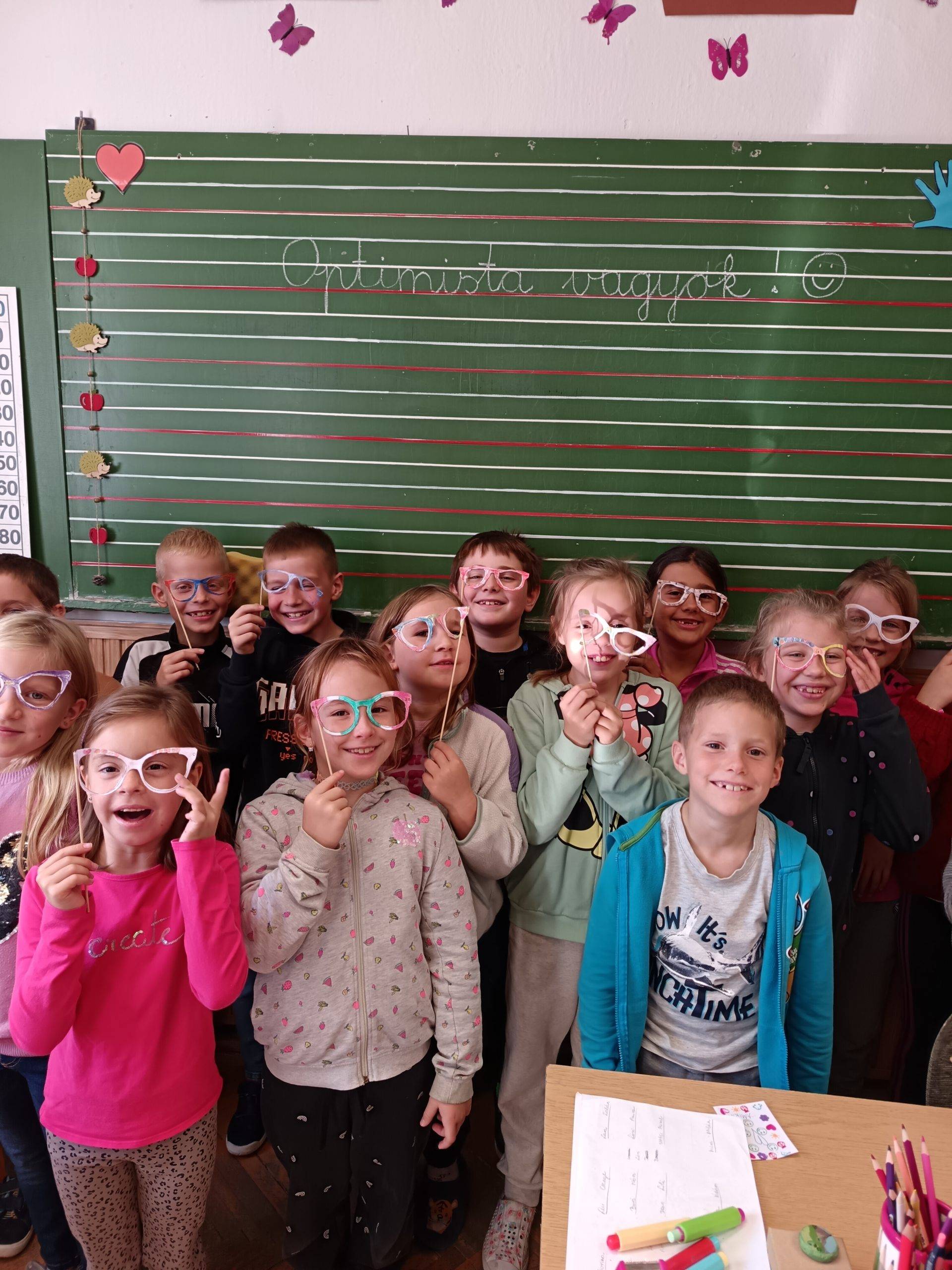 Az optimizmus egy nagyon közkedvelt téma volt a másodikosok körében. Rendkívül tetszett nekik Vidámfalva története a varázsszemüveggel, amit aztán természetesen mi is elkészítettünk.