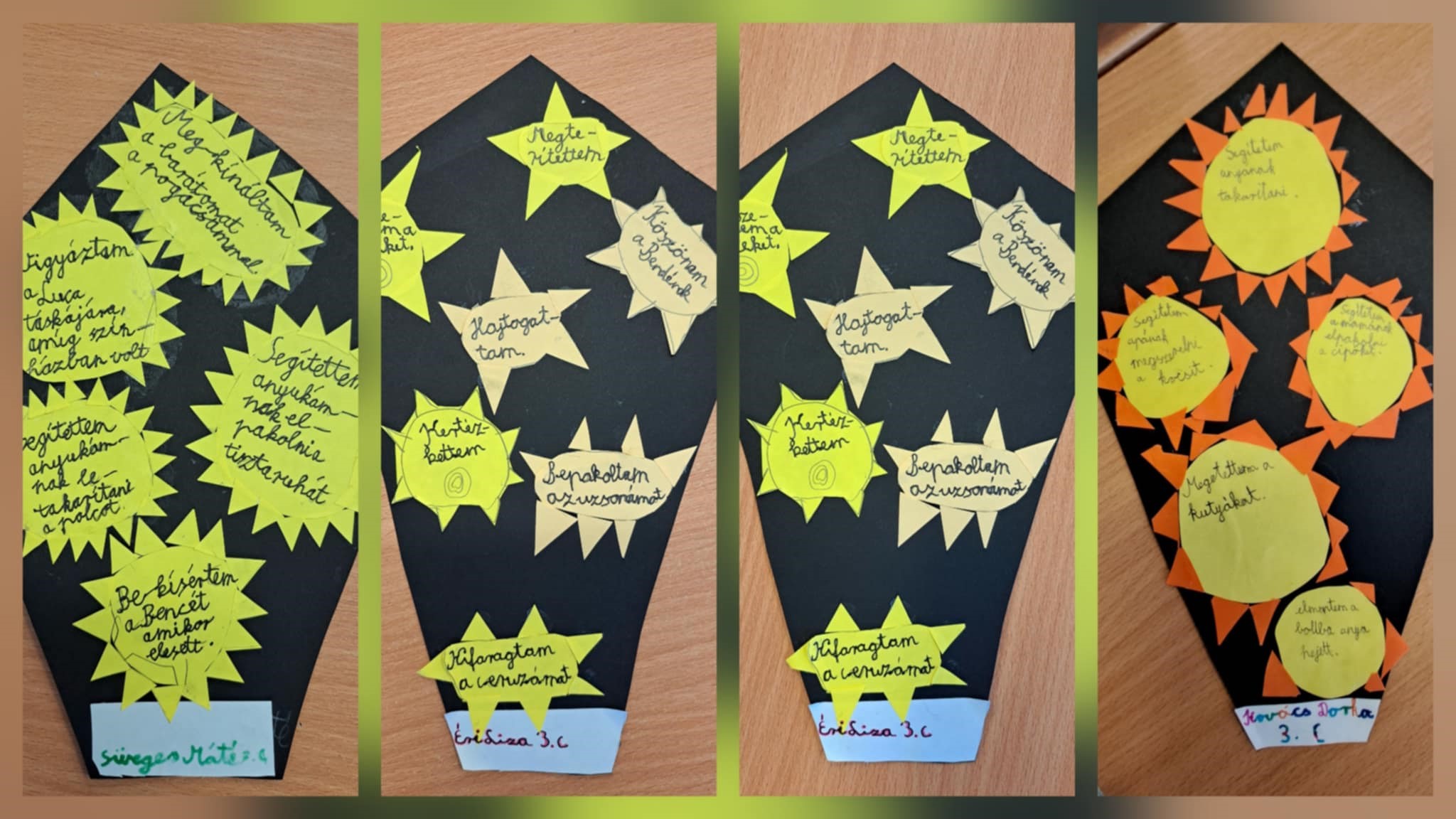 A foglalkozás elején beszélgetést folytattunk a jócselekedetek jelentőségéről és arról, hogyan tudunk egymásnak segíteni a mindennapokban. Ezt követően a gyermekek Márton-napi lámpást készítettek. A hét során minden nap felírtak egy-egy aznapi jócselekedetet, amelyet elvégeztek vagy megtapasztaltak. Ezek a gondolatok a lámpás részévé váltak, így az alkotás fokozatosan telt meg tartalommal.