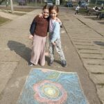 A boldogságórák során arra törekedtünk, hogy a gyerekek megtapasztalják, milyen fontos egymásra figyelni, meglátni a jót a másikban. Az iskola udvarát, annak is az aszfaltos részét krétarajzokkal színesítettük, virágtáncot jártunk.