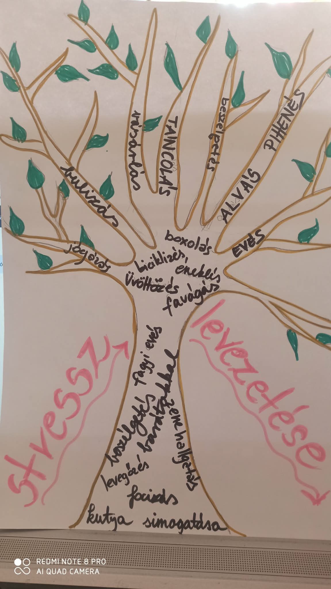 A megküzdési stratégiák témakört csoportmunkában kezdtük el feldolgozni. Összeírtunk egy listát azokról a módszerekről, amiket a stressz levezetésére használunk. Ezt követően egy fát rajzoltunk, melynek ágaiba beleírtuk ezeket. megosztottuk egymással a különböző tevékenységeket, amiket már sikerrel használtunk a nehéz helyzetek megoldására. Néhányat meg is csináltunk: napfürdőzés, zenehallgatás, beszélgetés, kerti munka. Csatlakoztunk továbbá a 10 millió Fa Alapítvány és a Boldogságóra program együttműködése keretében megrendezésre kerülő faültetési akcióhoz.