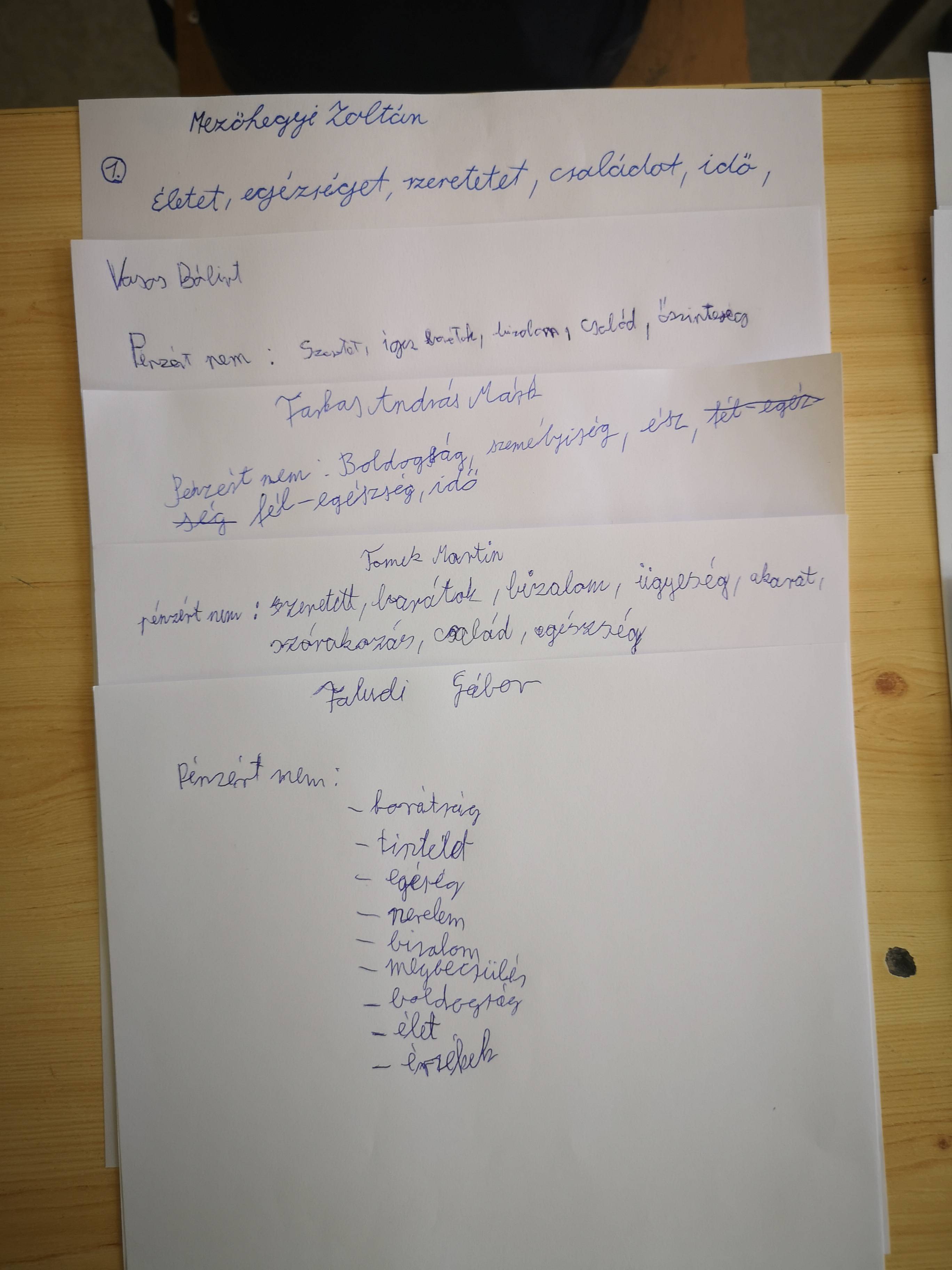 A foglalkozás elején a „Vita” című gyakorlatot végeztük el. Ezt követően arra kértem a tanulókat, hogy írják le, szerintük mit nem lehet pénzért megvenni. Ezután nem párban, hanem közösen beszéltük meg a leírtakat. Tanulságos volt, és igazán jó kis vita kerekedett ki belőle.