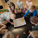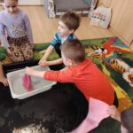 Aktuális hetünk témája a víz. Megismerkedtünk különböző halmazállapotaival, majd ételfesték segítségével vizet színeztünk, ami nagy örömet okozott a gyerekeknek. Ezt követően különböző tárgyakkal kísérleteztünk, megfigyelve, mi süllyed el a vízben és mi marad a felszínen. A tevékenységet egy érdekes feladattal zártuk: egy rongyot dobtunk a vízre, megvártuk, amíg megszívja magát és elsüllyed, majd kicsavartuk és kiteregettük. Ezzel a játékkal matematikai tapasztalataik is bővültek, valamint finommotoros készségeik is fejlődtek.