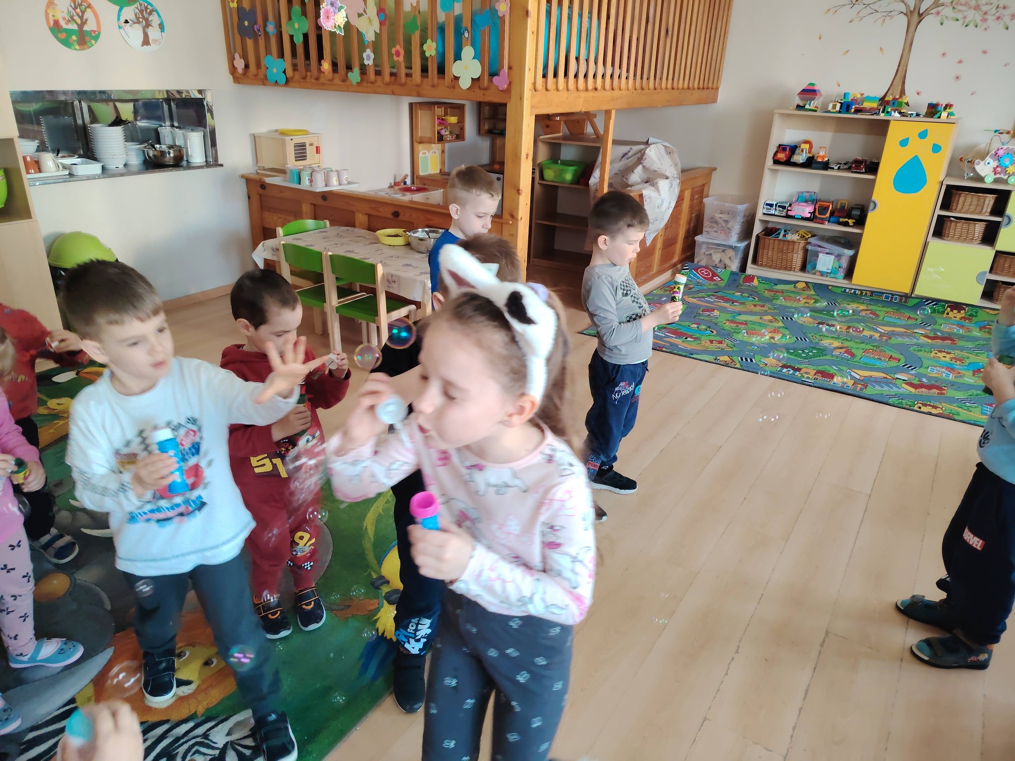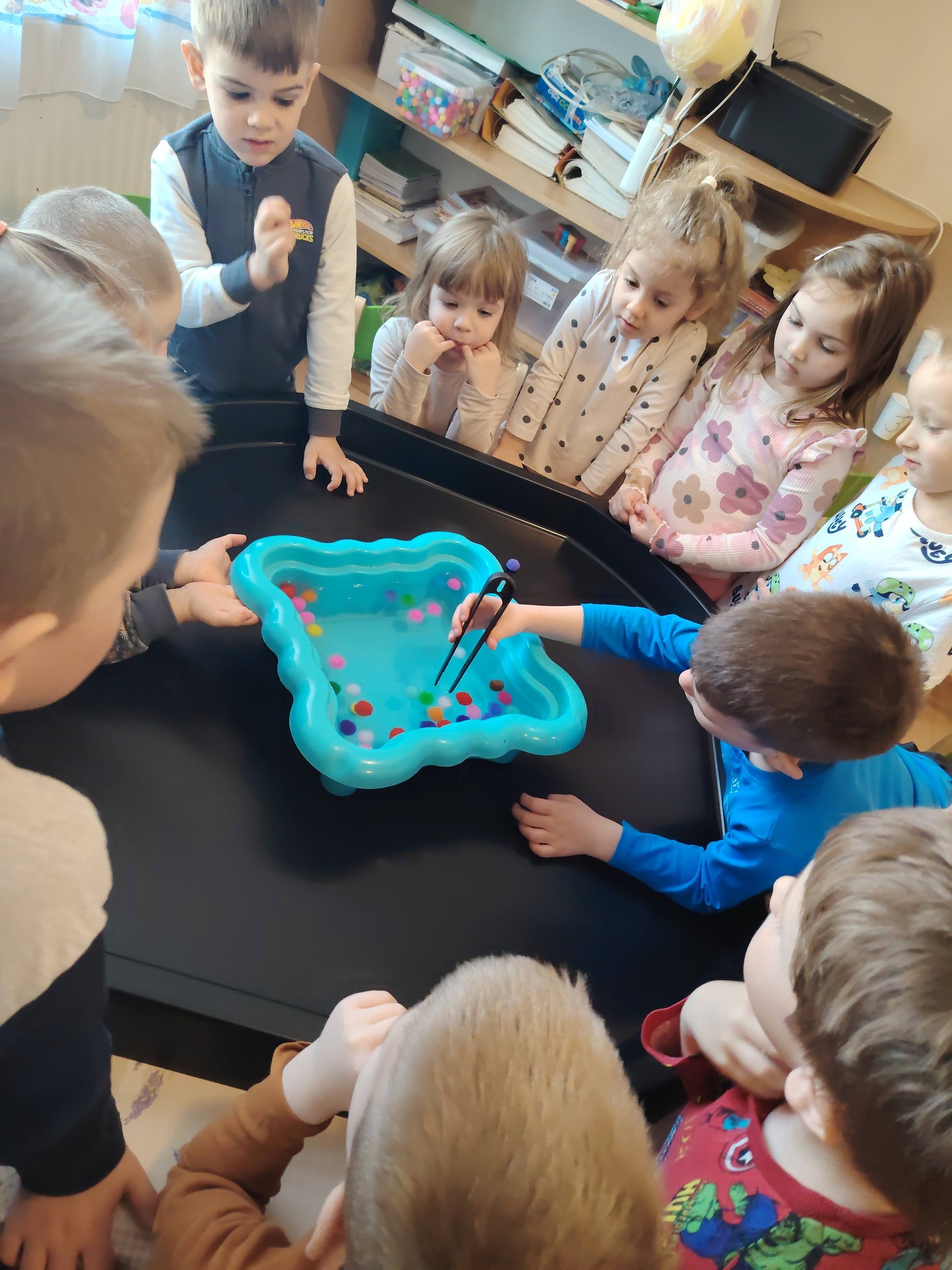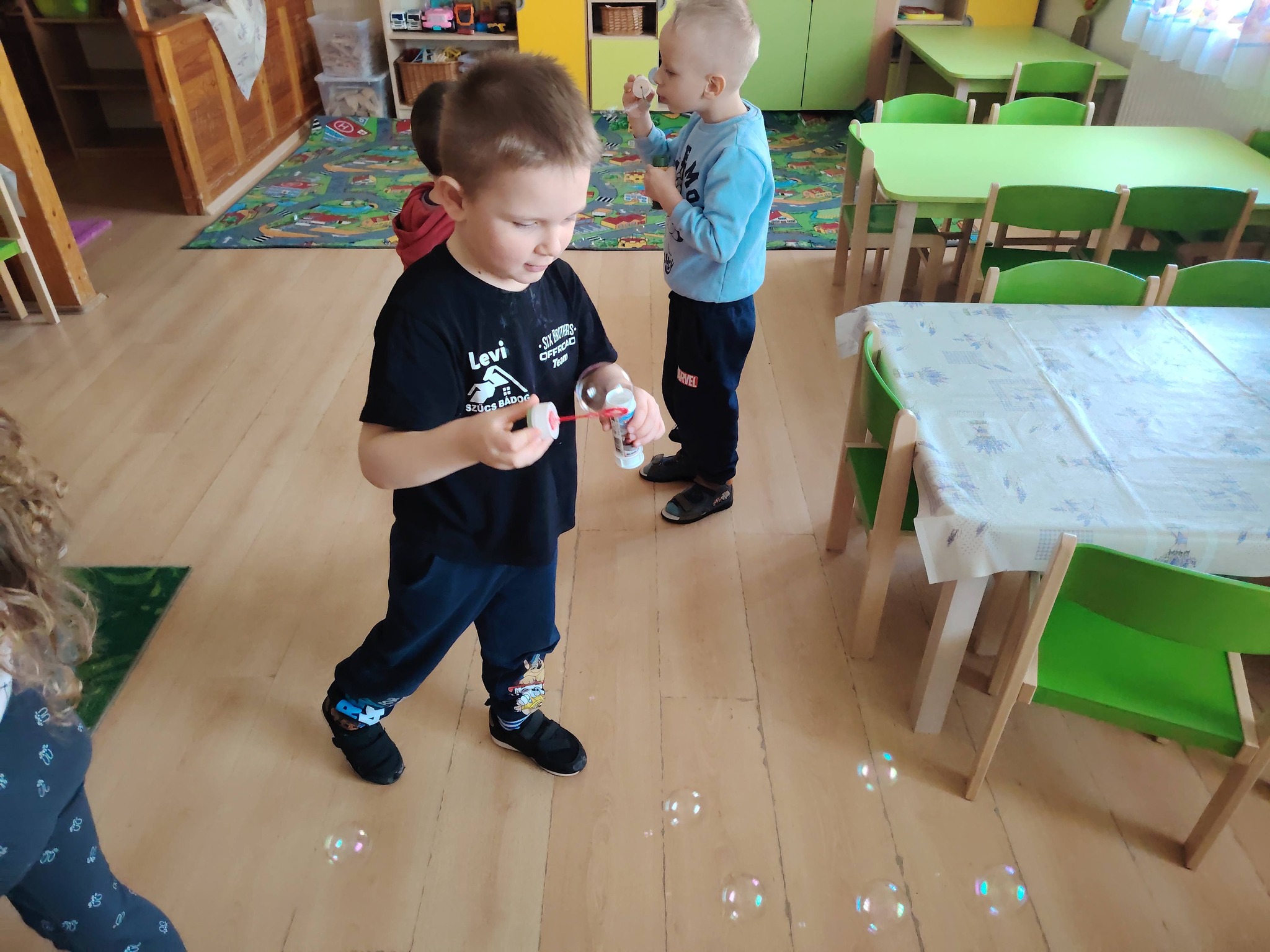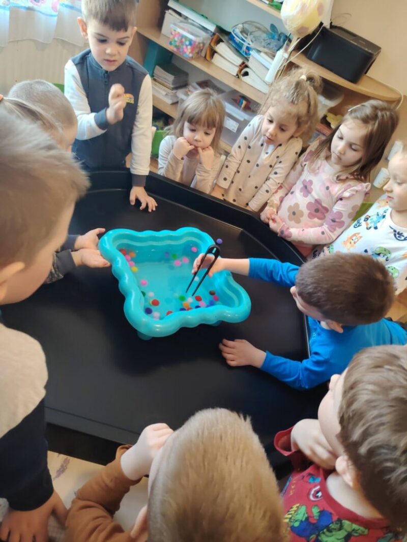 A hét során horgászós játékot is játszottunk, melynek során pomponokat kellett különböző csipeszekkel „kihalászniuk” a vízből. Ez a tevékenység szintén hozzájárult a finommotorika fejlődéséhez. A foglalkozást buborékfújással tettük még élvezetesebbé, melynek segítségével a száj körüli izmokat is erősítettük.