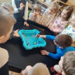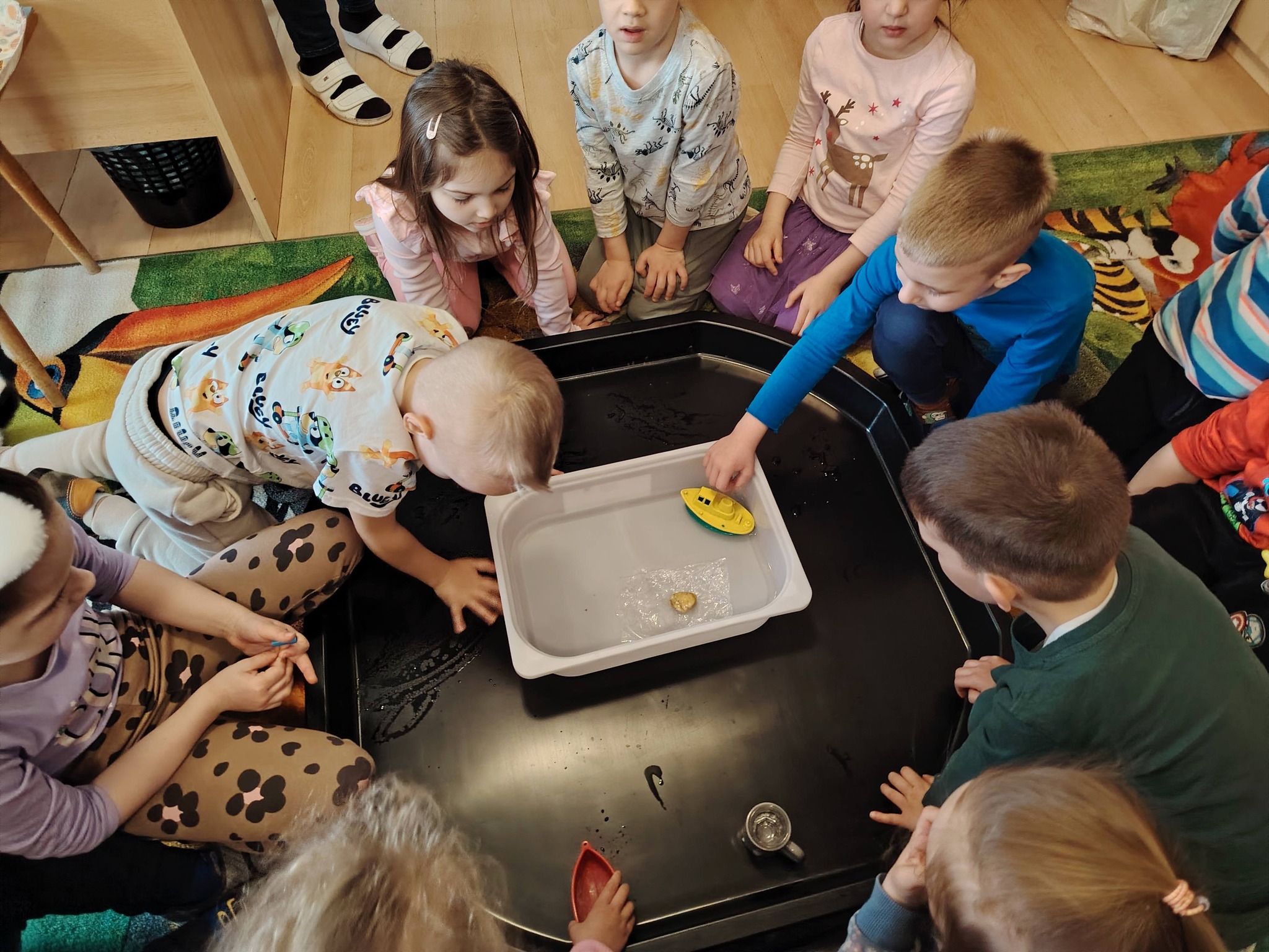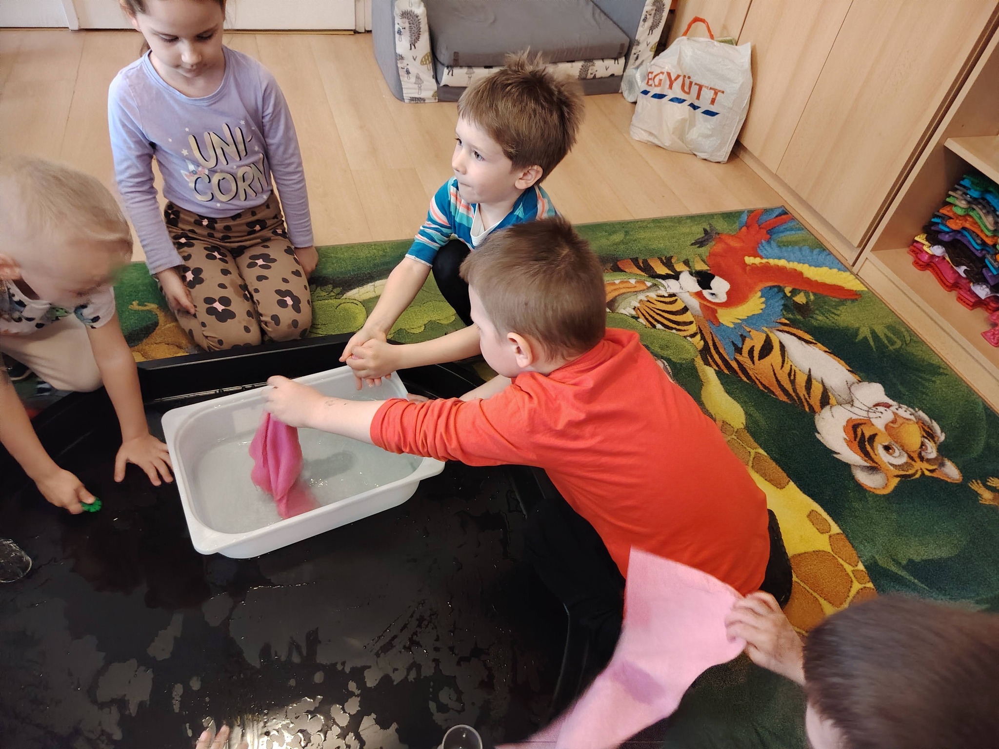Aktuális hetünk témája a víz. Megismerkedtünk különböző halmazállapotaival, majd ételfesték segítségével vizet színeztünk, ami nagy örömet okozott a gyerekeknek. Ezt követően különböző tárgyakkal kísérleteztünk, megfigyelve, mi süllyed el a vízben és mi marad a felszínen. A tevékenységet egy érdekes feladattal zártuk: egy rongyot dobtunk a vízre, megvártuk, amíg megszívja magát és elsüllyed, majd kicsavartuk és kiteregettük. Ezzel a játékkal matematikai tapasztalataik is bővültek, valamint finommotoros készségeik is fejlődtek.