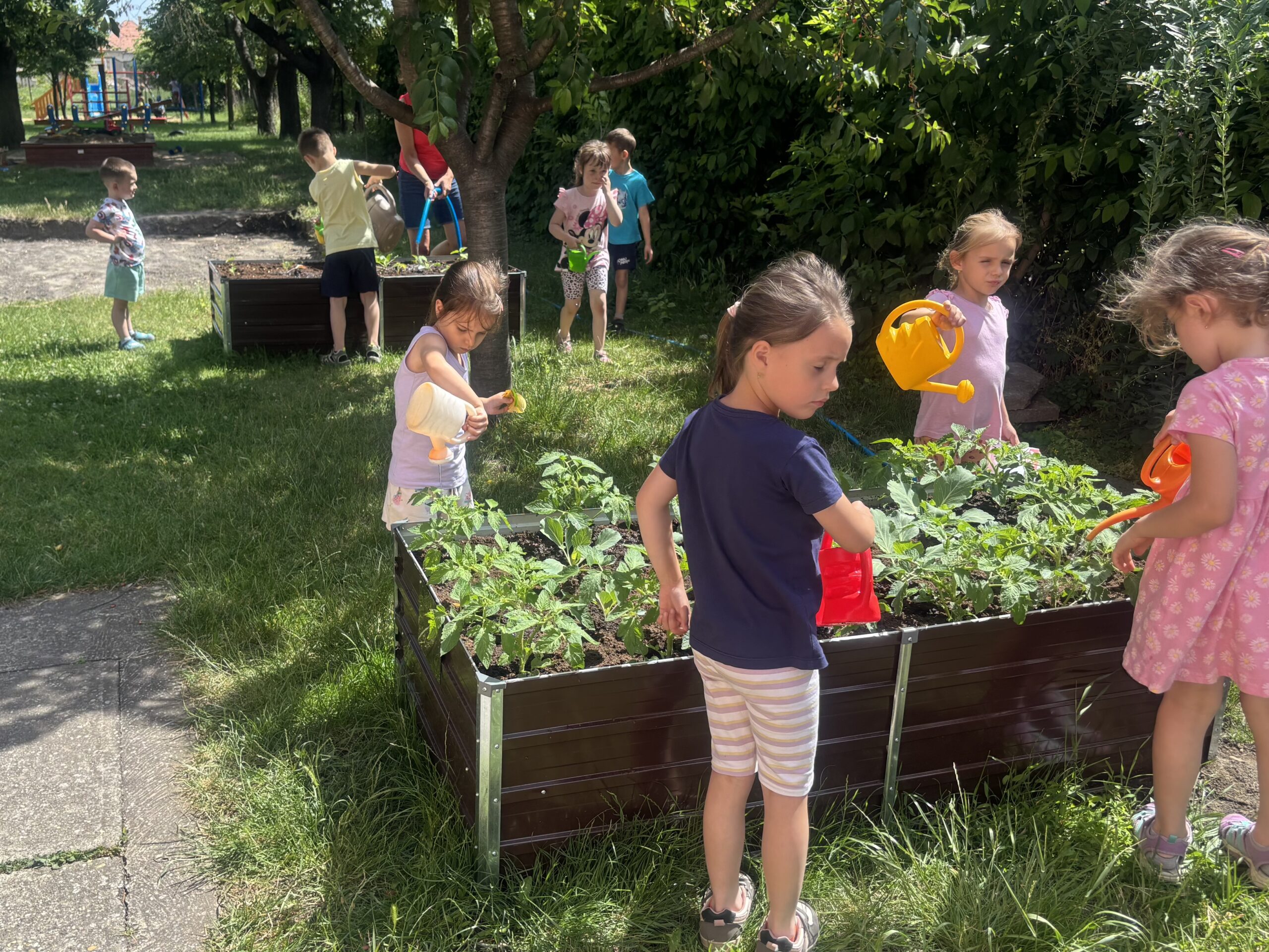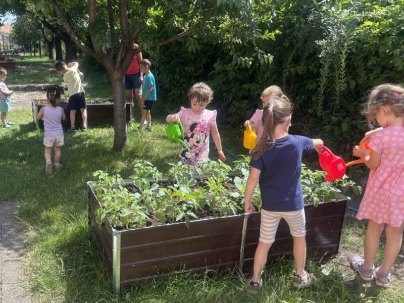 A gyerekekkel közösen paradicsom, káposzta és uborka palántákat ültettünk az óvoda udvarán található magas ágyásban. Naponta figyelemmel kísérjük a növények fejlődését. Szívesen segítenek a gyomlálásban, öntözésben is. Már nagyon várják, hogy megkóstolhassák a zöldségeket!