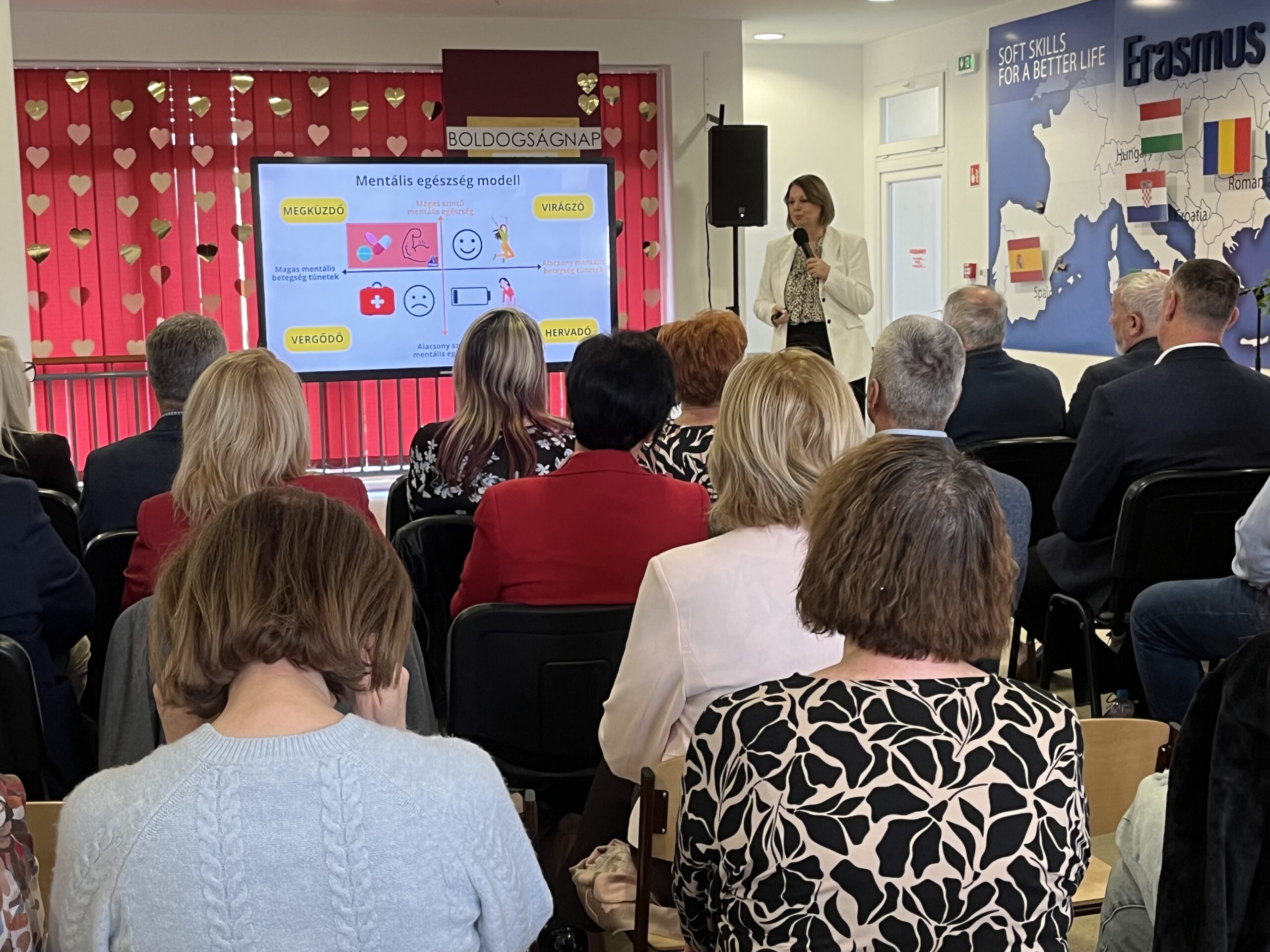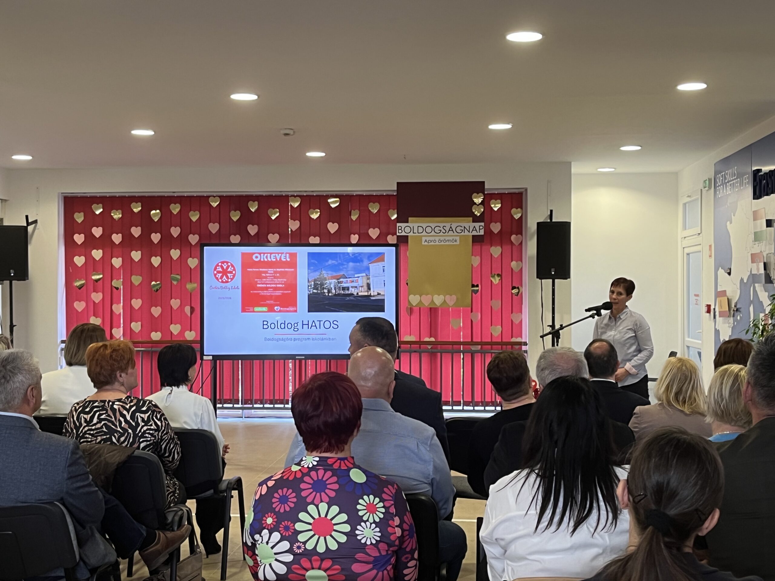 A nap során Bagdi Bella, pszichológus, a Boldogságóra Program alapítója előadásában a boldogság – vagyis a jóllét, boldogulás és emberi virágzás – tudományos megközelítéséről hallhattunk, míg Szalay Gabriella, a helyi Boldog Iskola csoport vezetője betekintést adott abba, hogyan él a program a mindennapokban a vépi intézményben.