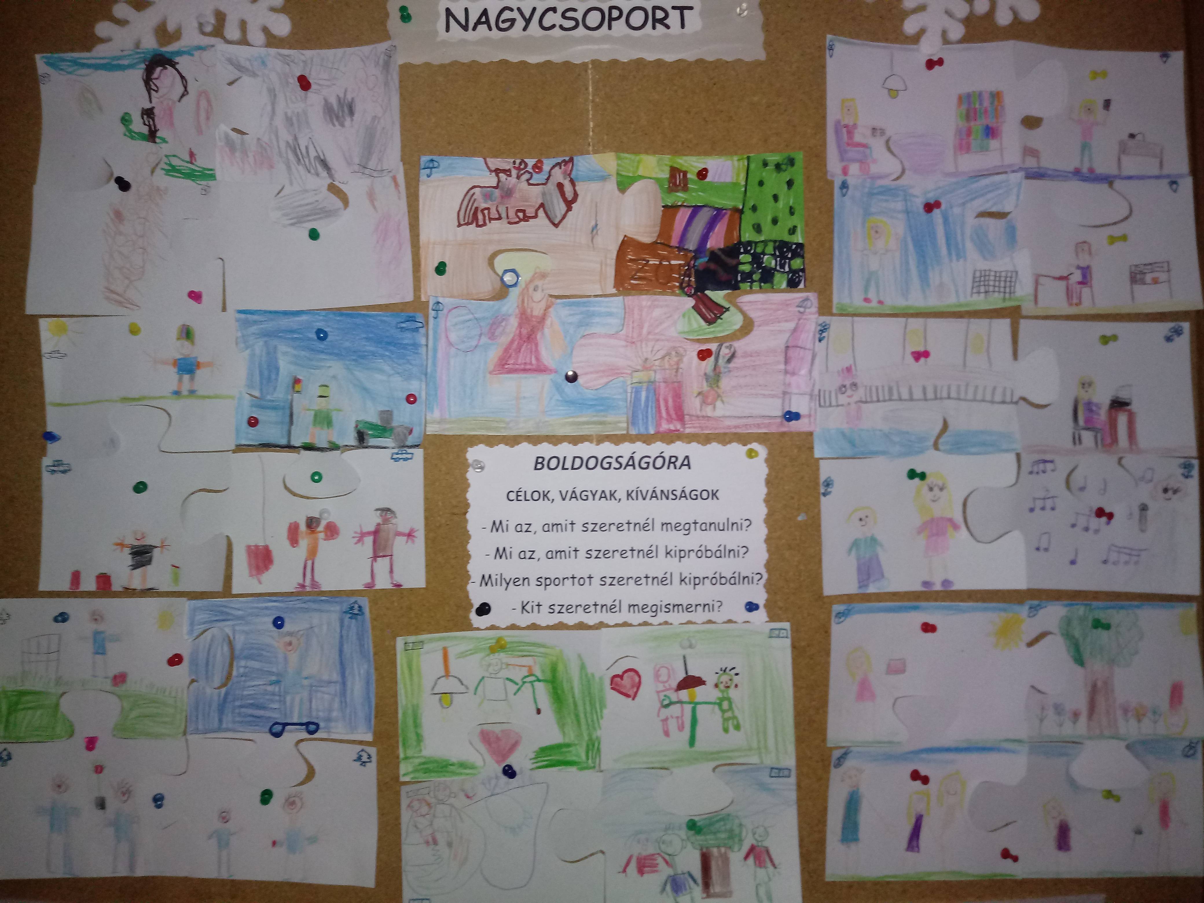 A januàri boldogsàgòrànkat az òvodànk téli „Egészéghetén” tartottuk meg, amelynek egyik témàja a lelki egészség volt.A boldogsàgòràt célbadobàssal kezdtük. Közben megbeszéltük, hogy nem szabad elkeseredni vagy feladni, ha nem sikerül célba talàlni, hanem kitartòan újra és újra meg kell pròbálni.Utàna felidéztük a régi emlékeinket, amikor az iskolàsok làtogattak el hozzànk és együtt beszéltük velük a céljainkròl.Természetesen ezúttal is mindenki elmondhatta gondolatait, vàgyait, céljait.A beszélgetést követõen a nagyobbak „Cél puzzlét” készítettek, amelyet kihelyeztünk a faliújsàgra.