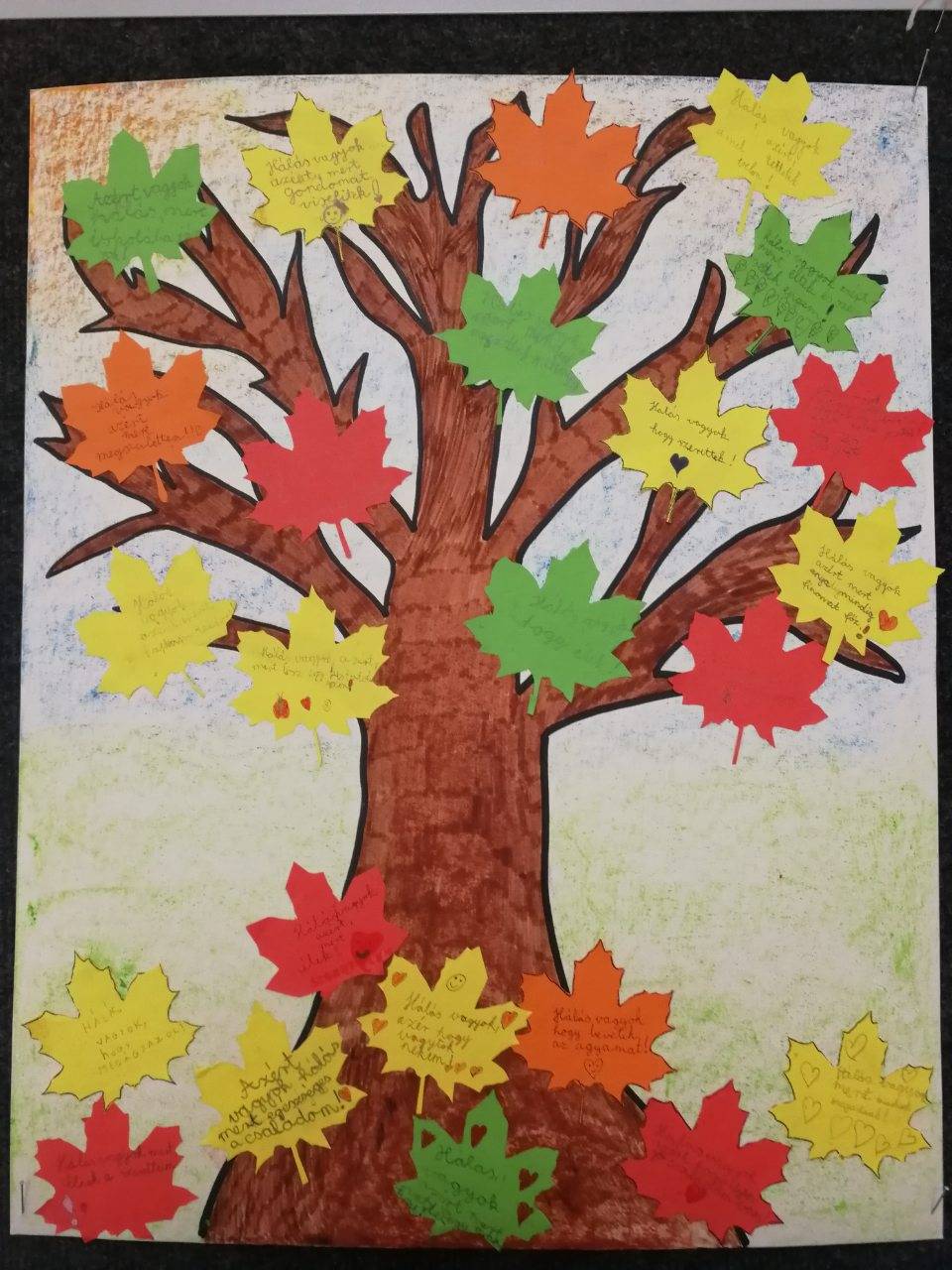 A mókás manókkal színes hálafát készítettünk. Közösen megrajzoltuk a fát és a hátteret, majd hálaadó mondatainkkal teletűzdeltük színes levelek formájában. Mindenki örömmel írta le, hogy az elmúlt időszakban miért ad hálát. Csoportunkban a boldogságóra alatt a pozitív gondolatok, megjegyzések száma számottevő volt. Az együtt töltött idő alatt a boldogságdalok tették meghittebbé a pillanatokat.