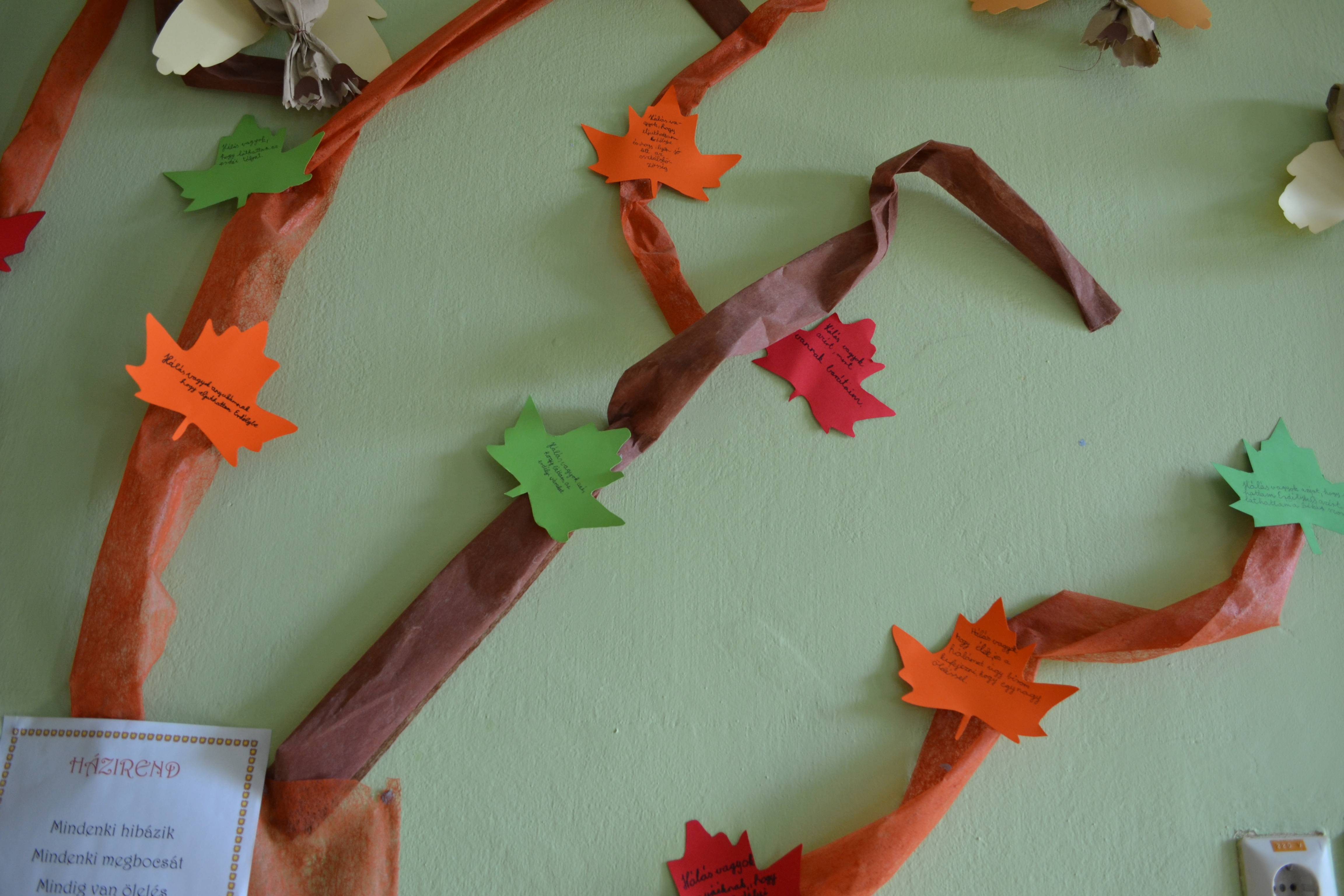 Óvodánk Bóbita csoportos óvodásai, miután meghallgatták a Hálafa történetét, hálakezekből elkészítették a csoport hálafáját. A hálakezekre lerajzolták , mi az ,amiért ők hálásak, majd mielőtt felhelyezték volna a fára, bemutatták társaiknak is.