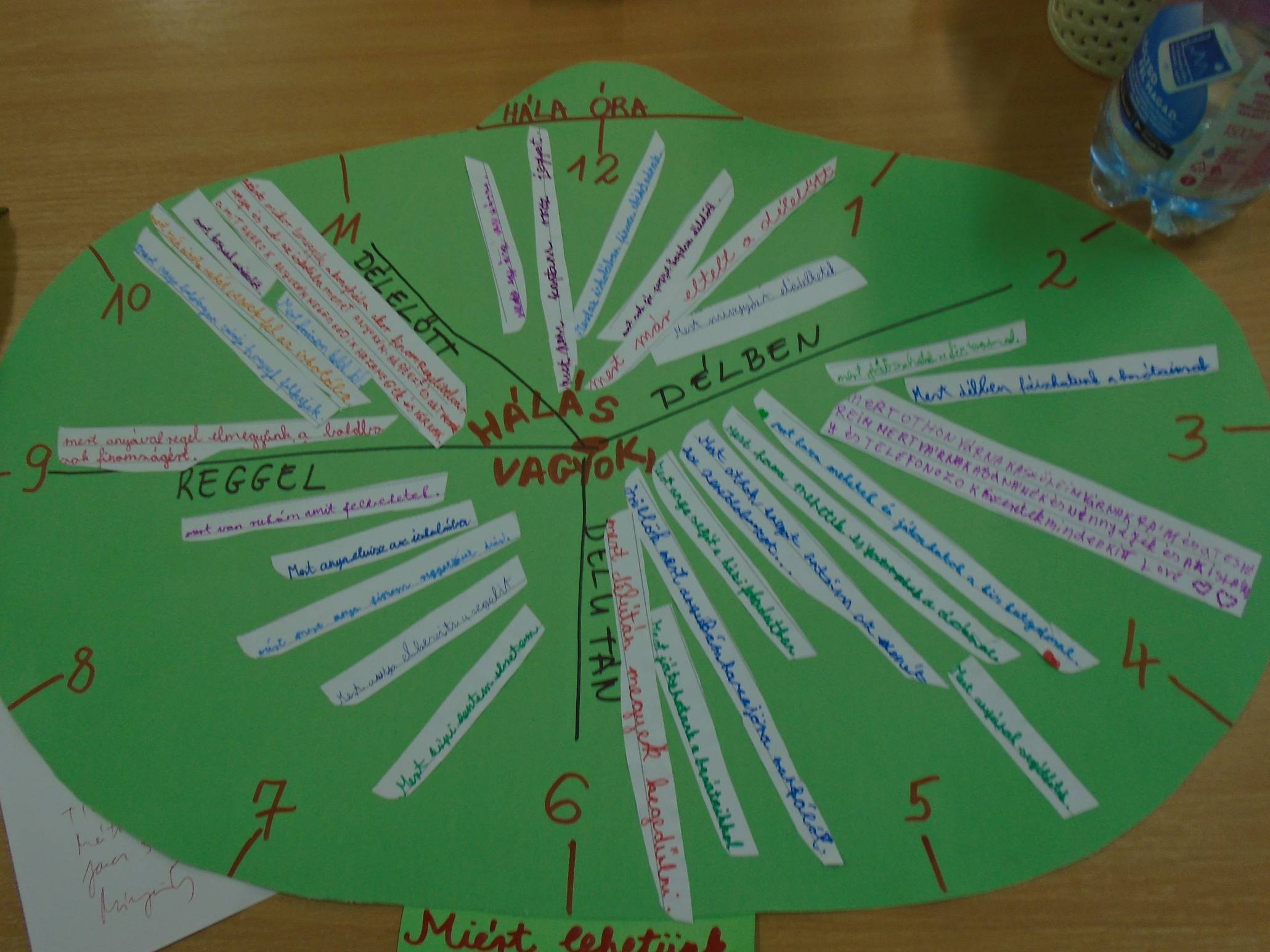 Ezek után mindenki papírcsíkokat kapott, melyre azt lehetett ráírni, hogy minek és kinek lehetünk hálásak reggel, délben és este. A papírcsíkokat felragasztottuk egy tablóra, végül az óra emlékére egy közös képet készítettünk.
