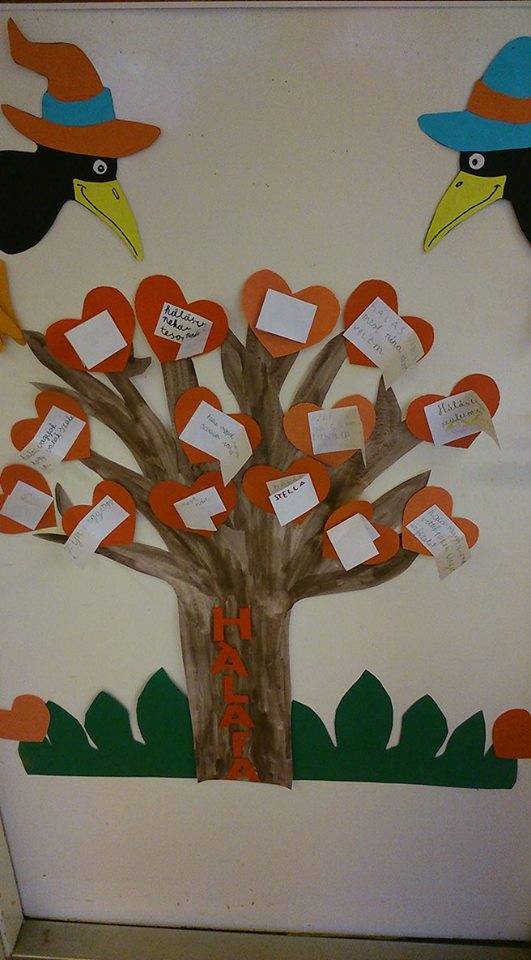 Csoportomat ez év szeptemberében kaptam meg, még az ösdzeszokás időszakában vagyunk. Fontosnak tartom hogy a gyermekek már kis korban tudják kifejezni érzéseiket, ezért is vágtam bele a Boldogság óra programba. Motivációként meghallgattuk a hónap dalát, kértem a gyerekeket hogy feküdjenek le a szőnyegre, úgy hallgatuk meg többször is. Majd eljátszottuk a leveles játékot először 1 majd 2 végül 3 levéllel. A játékot nagyon élvezték a gyerekek. Majd elmondtuk a mondókát és beszélgettünk a boldogságról a háláról. A foglalkozást egy hálafa elkészítésével zártuk, melyet a gyerekek kézlenyomatával készítettünk közösen.