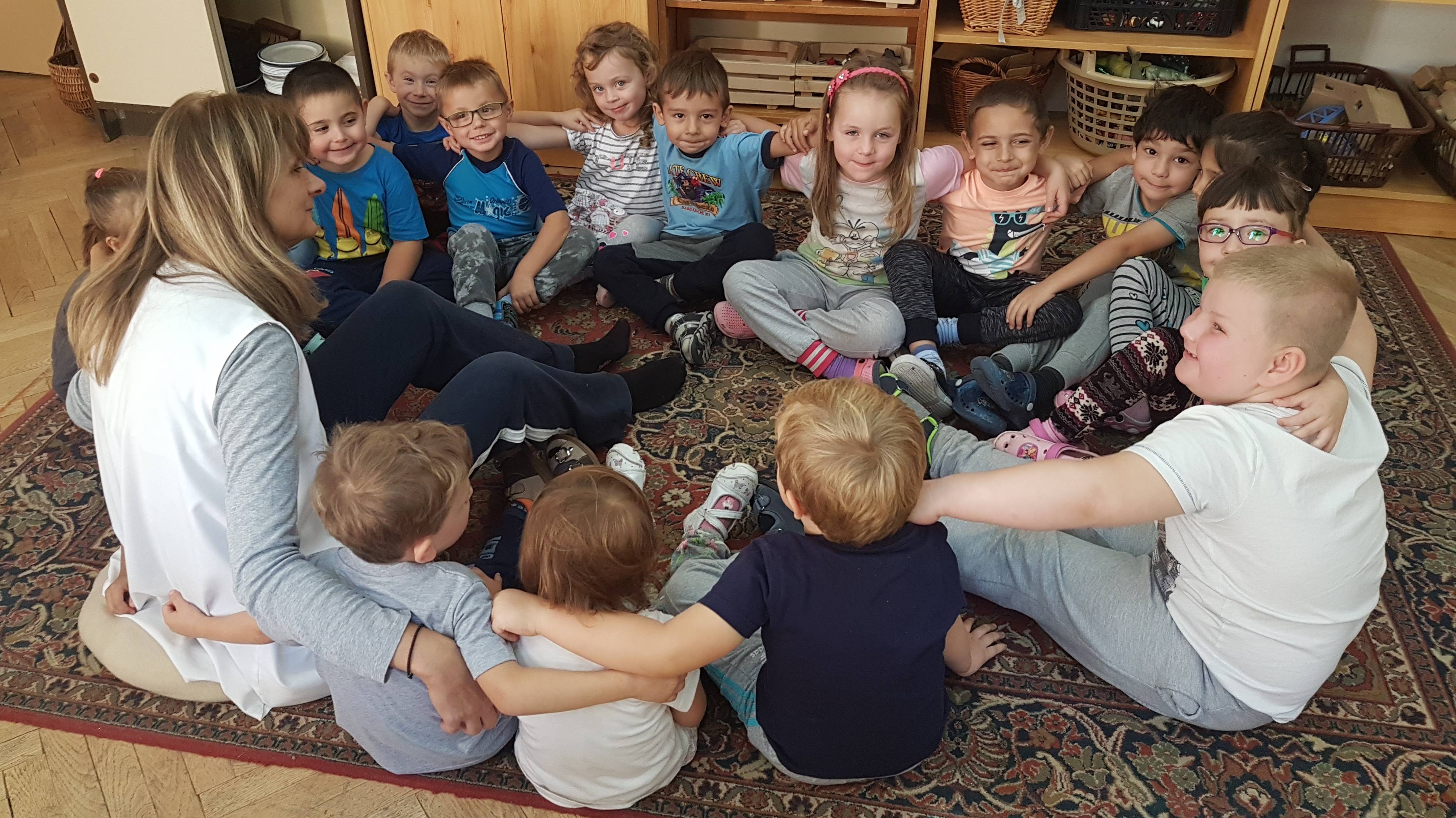 I. 1. A csoportban idáig alkalmazott, már megszokott dal felhangzására a gyerekek leültek a szőnyegre beszélgetéshez.