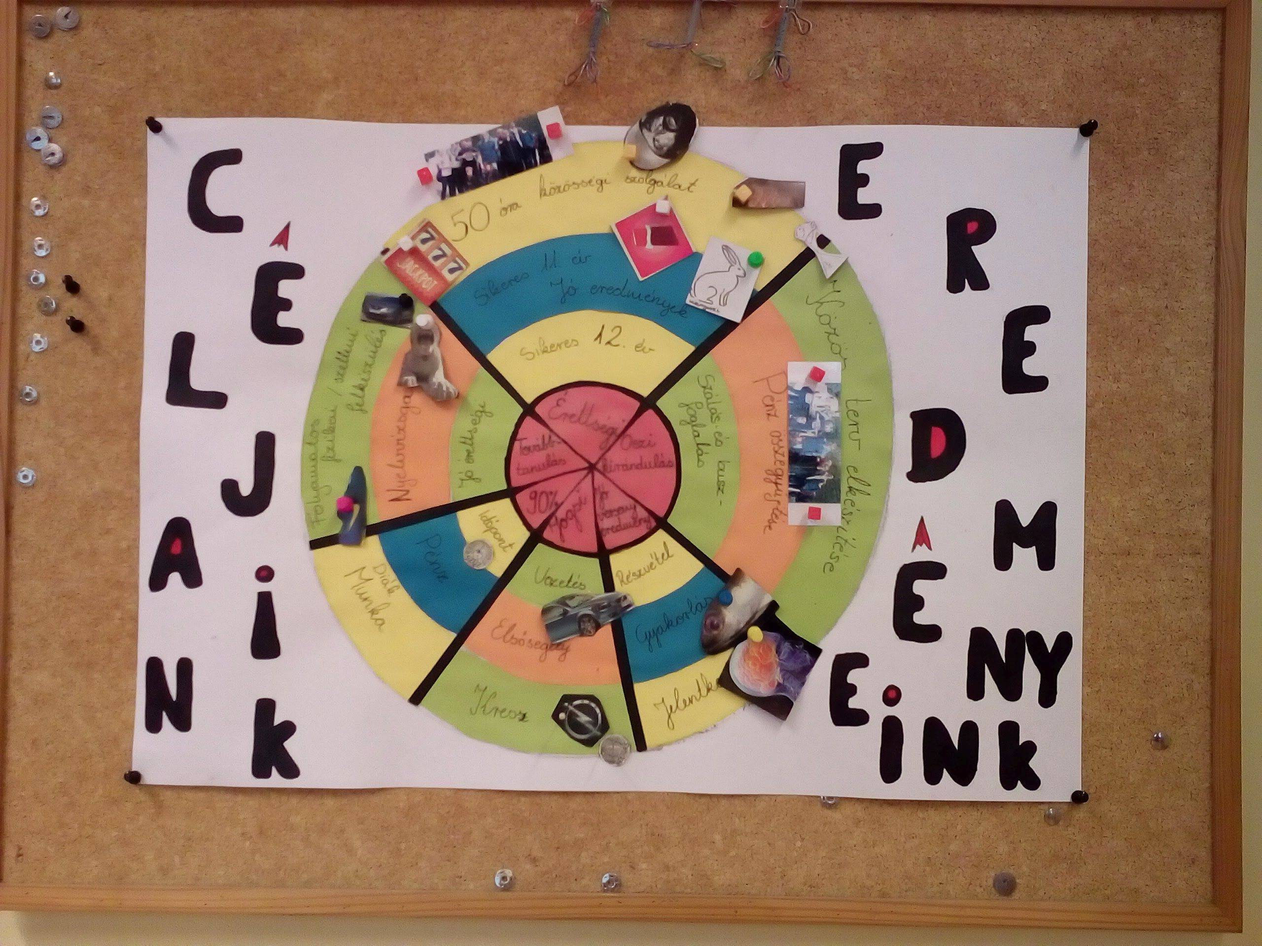 A céltáblát kifüggesztettük az osztályteremben, így a következő hónapokban is fontos részét képezi az osztály életének, hiszen mindenkit emlékeztet a céljaira, és láthatják, hogy célhoz vezető úton aktuálisan hol járnak, és mennyi van még hátra a teljesítésükhöz.