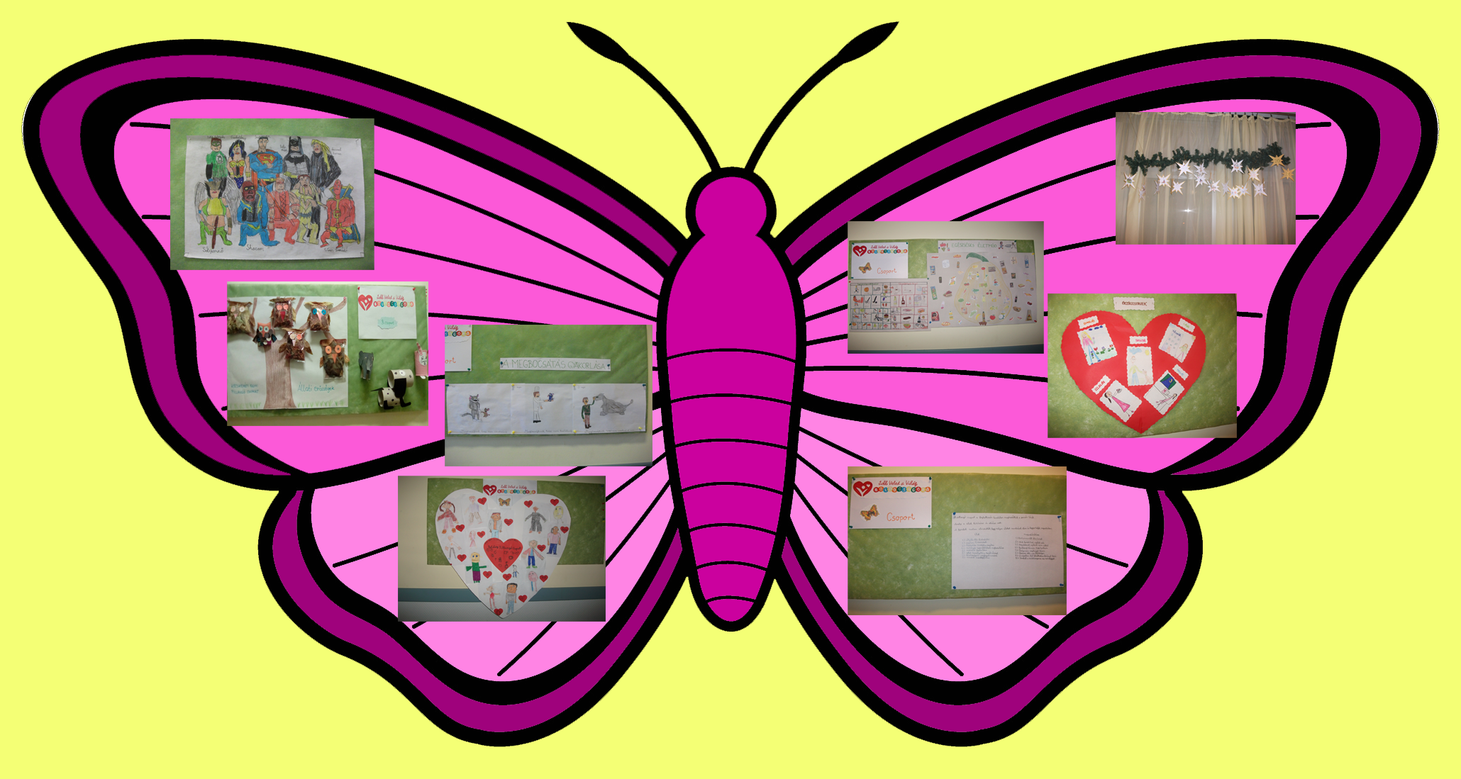 Az utolsó boldogságórán felelevenítettük az a tanév során beszélt témákat. A végén egy pillangóban ( hiszen pillangó csoport vagyunk ) feltettük az évközi munkáinkat- kiállítás címen.