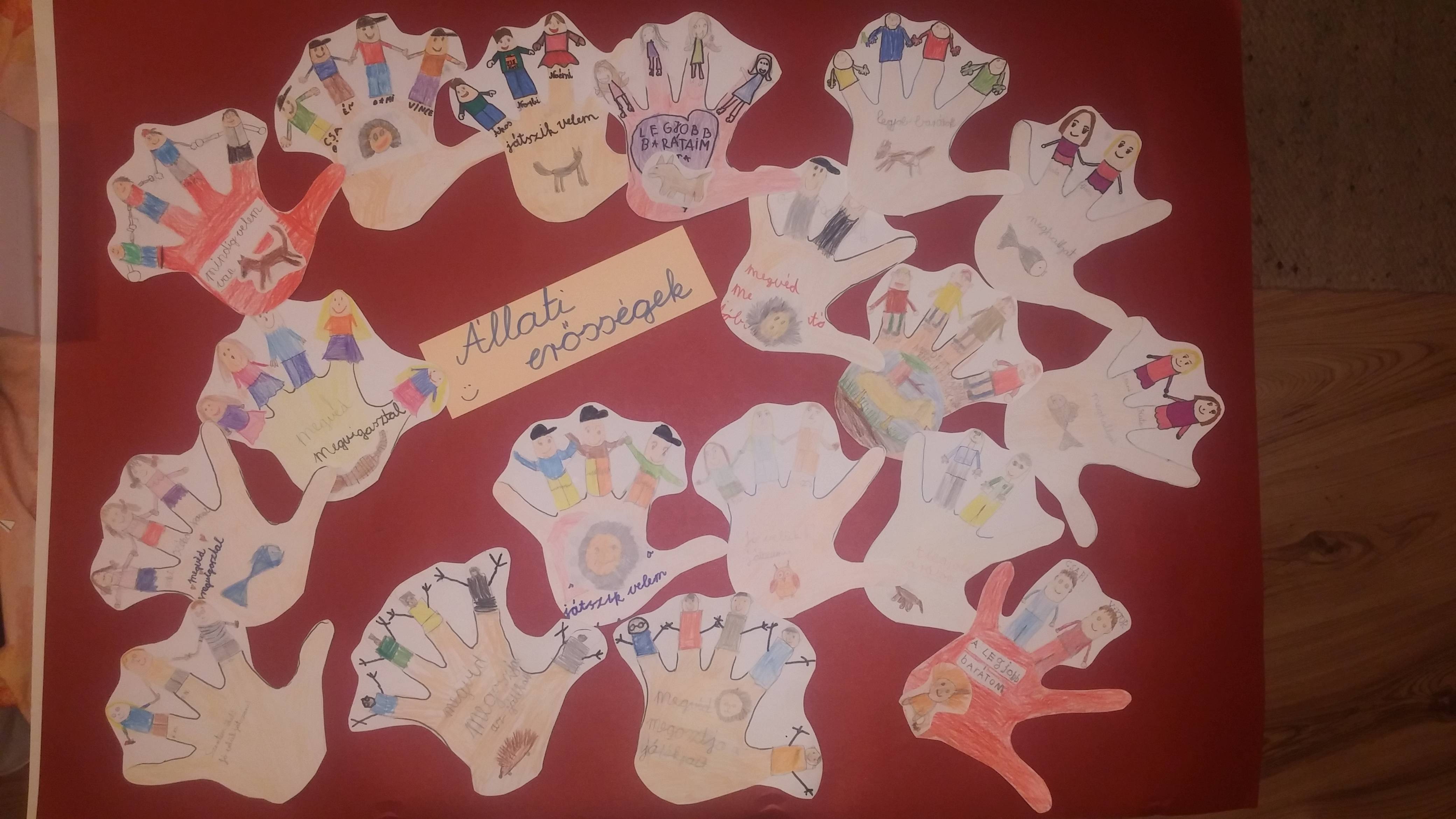 Az órát a hónap dalával kezdtük, majd összegyűjtöttük páros munkában, hogy milyen egy jó barát. Csukott szemmel maguk elé kellett képzelni a gyerekeknek, hogy kik veszik őket körül a közvetlen környezetben, majd azoknak a személyeknek a neve közeli, s egyre távolabbi körökbe került. Barátokról szóló közmondásokat kerestünk.Az óra végén egy plakát készült, hogyan tudják a gyerekek a barátokkal a kapcsolatot ápolni.